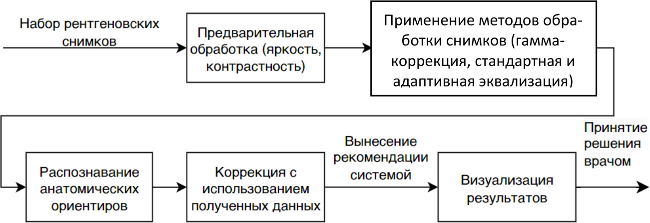 На основе результатов комплексного сравнительного анализа существующих методов обработки и анализа медицинских изображений была построена система поддержки принятия врачебных диагностических решений для врачей-травматологов. Система основана на автоматизированной обработке и анализе рентгеновских снимков пациентов с целью выявления признаков травм и повреждений опорно-двигательного аппарата. Блок-схема, иллюстрирующая работу данной системы, представлена на рис. 8.