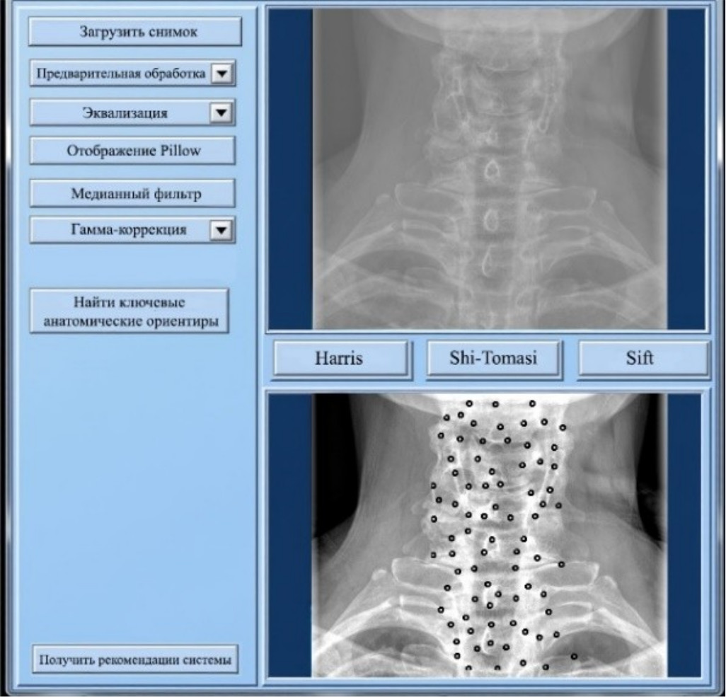 - кластеризация и распознавание анатомических ориентиров. Алгоритм Shi-Tomasi применяется для выделения ключевых элементов позвоночника на изображениях, сгруппированных в 5–6 кластеров. Точность распознавания достигает 95 %;