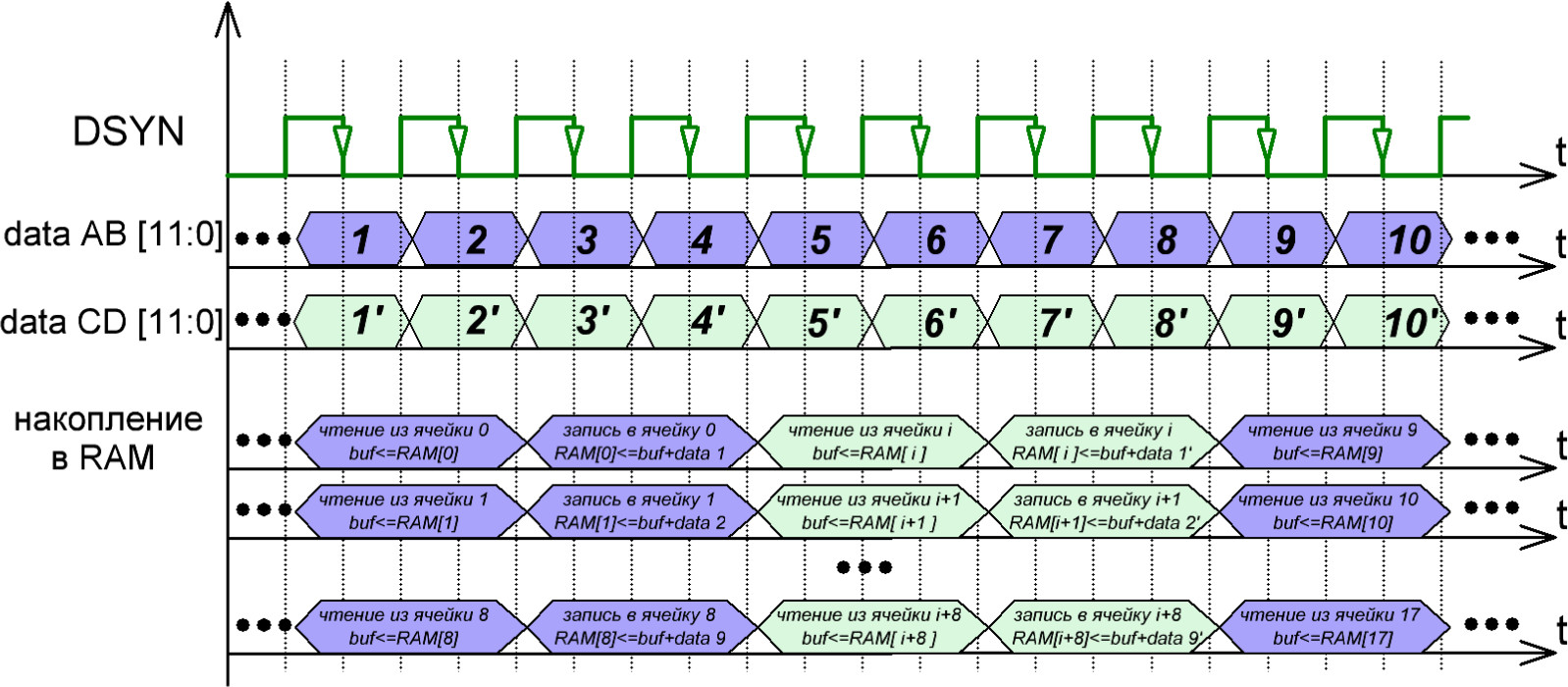 Для решения описанной проблемы был разработан метод и HDL (Hardware Description Language) описание для ПЛИС, позволяющие формировать цельный кадр в СОЗУ из нескольких реальных кадров, выдаваемых матрицей. Суть метода состоит в том, что при захвате данных с параллельных шин матрицы начинается процесс записи с накоплением, за который матрица выдаст данные еще по нескольким следующим пикселям. Однако счетчик пикселей не останавливается, и по завершении процесса записи и накопления известно, сколько пикселей было пропущено. Далее захватываются следующие актуальные данные с параллельных шин матрицы и процесс записи с накоплением повторяется вновь, однако адрес ячейки СОЗУ смещается с учетом пропущенных пикселей, и т. д. Таким образом, после первого кадра с матрицы в СОЗУ остаются «прореженные» данные, полная информация об изображении собирается из нескольких реальных кадров, т. к. каждый следующий пишется со смещением адреса как пикселя, так и ячейки СОЗУ на единицу. Полный кадр в СОЗУ формируется за количество реальных кадров матрицы, равное количеству пропущенных пикселей за время записи с накоплением в СОЗУ (стабильное значение для указанных ИМС составляет 8). Иллюстрация описанного метода показана на рис. 6. DSYN – синхроимпульс для тактирования пакетов данных. Data AB и CD – потоки данных с квадрантов матрицы, поскольку матрица разбита на области A, B, C и D.