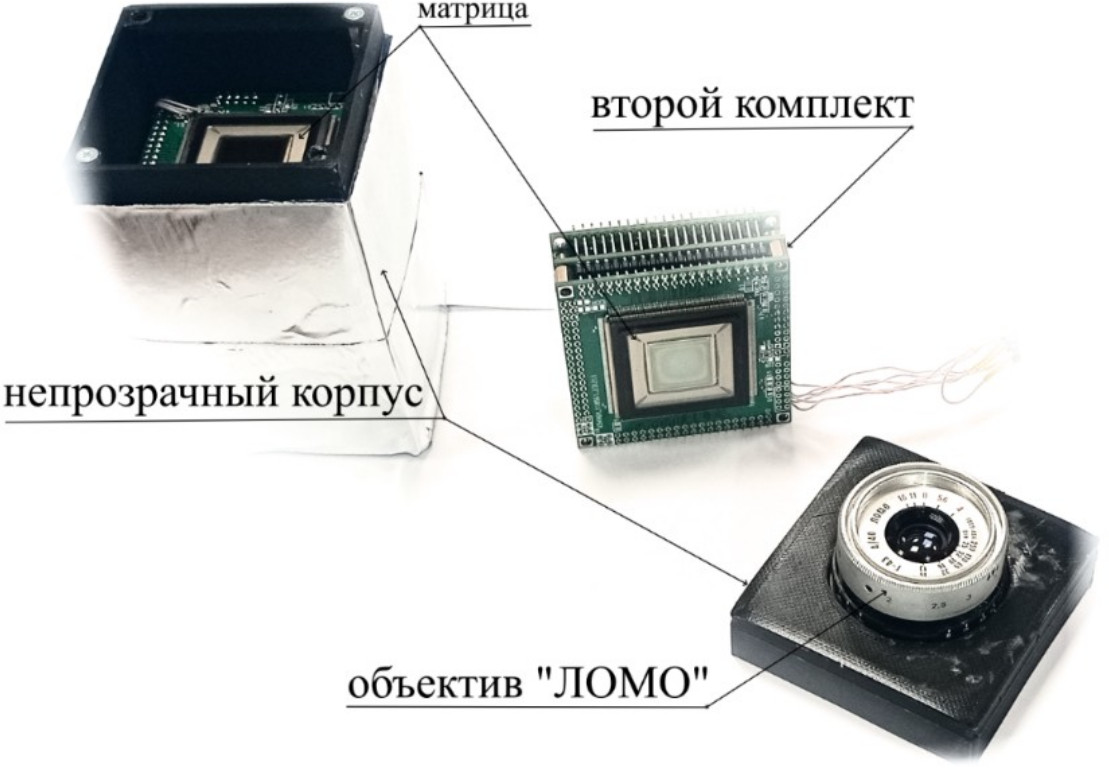 Для реальных испытаний системы был напечатан на 3D-принтере оптически непрозрачный корпус и добавлена оптическая система в виде объектива «ЛОМО» от пленочного фотоаппарата «СМЕНА». Макет системы в разборе показан на рис. 8, где также показан внешний вид электроники без корпуса.