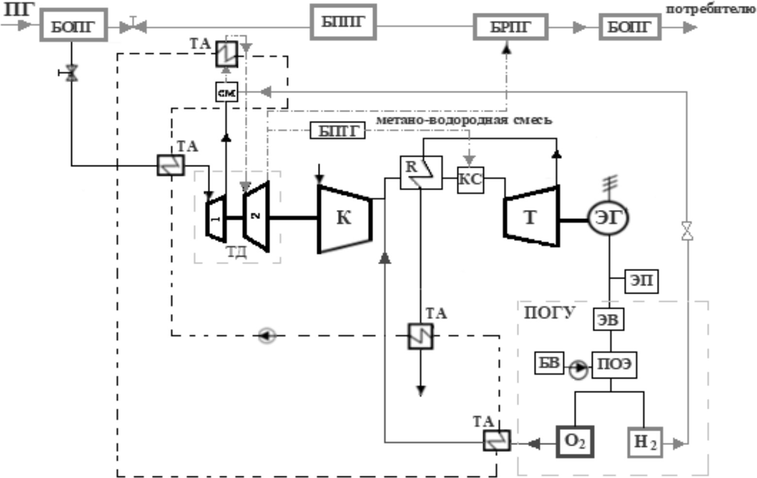Природный газ (ПГ) высокого давления после блока очистки на ГРС подогревают в теплообменном аппарате (ТА) до 80–100 °С, расширяют в ступени I турбодетандера (ТД). Полученный в электролизере водород с давлением 3 МПа сепарируют и подают во вторую ступень турбодетандера с образованием метано-водородной смеси. МВС расширяют в турбодетандере до давления 1,5 МПа и основную часть подают в блок редуцирования газа ГРС для поддержания заданного договорного давления для потребителя, а меньшую часть – в блок подготовки топливного газа для ЭГТДУ.
