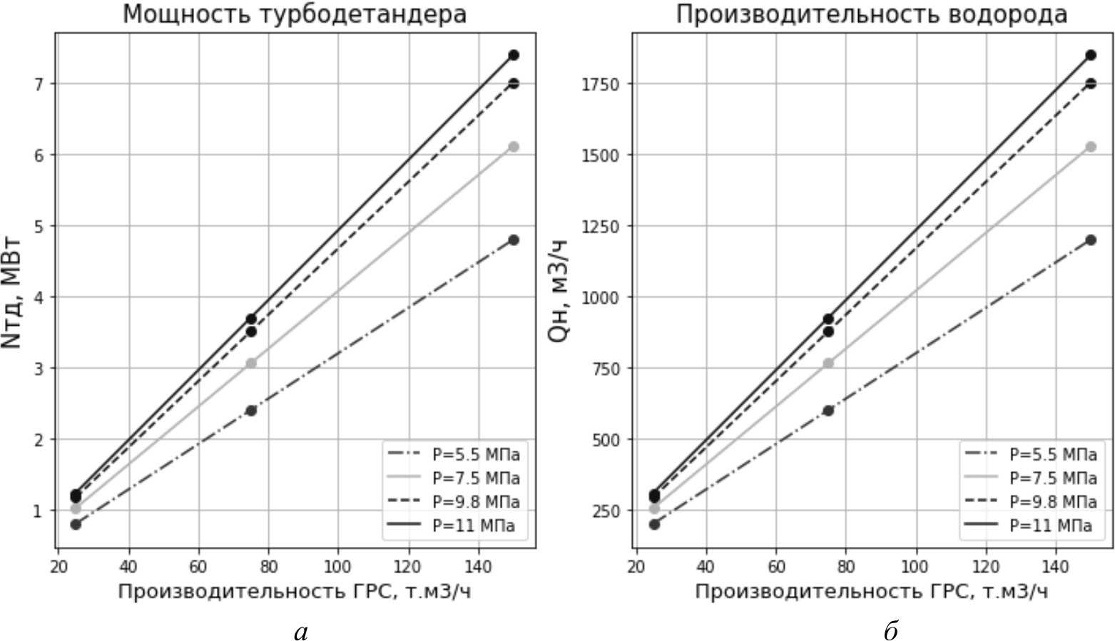 На графиках показано изменение мощности ТД (рис. 2, а) и количество производимого водорода за счет генерируемой энергии ТД (рис. 2, б) в зависимости от рабочего давления в современных МГ (11 МПа, 9,8 МПа, 7,5 МПа, 5,5 МПа) и производительности ГРС.