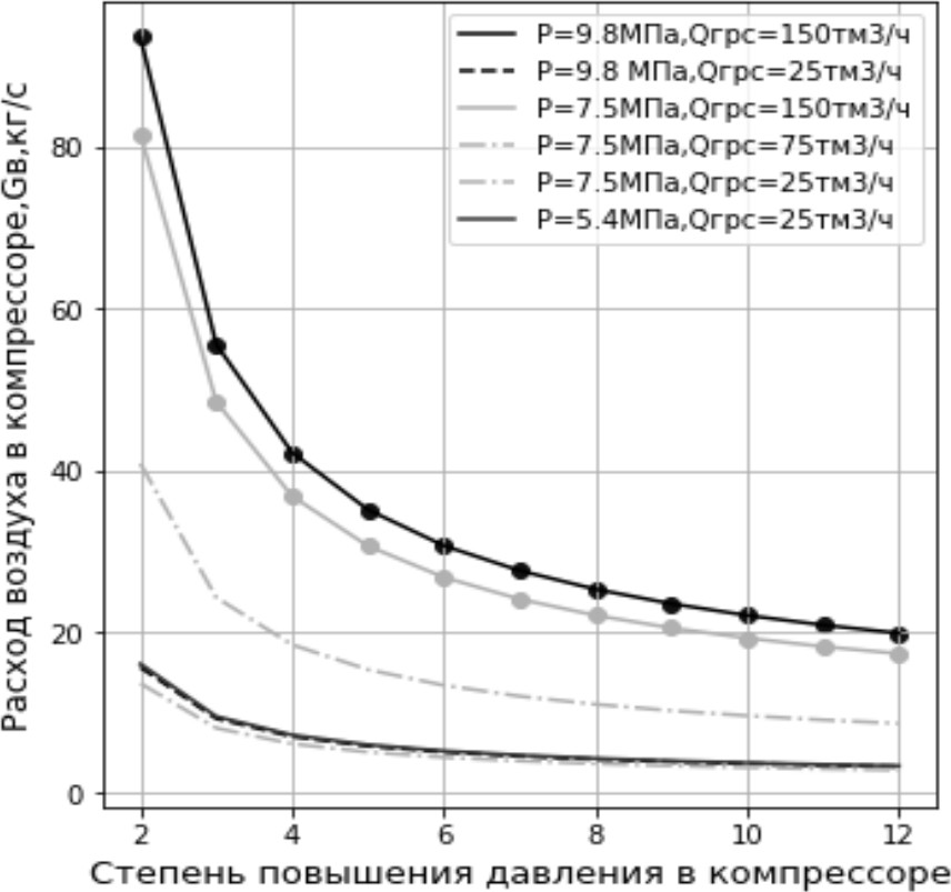 Для ГРС малой и средней производительности при рабочем давлении в МГ от 7,5 МПа и ниже и с увеличением πК ≥ 4 производительность компрессора составляет GвГТУ ≤ 20 кг/с. Такой расход воздуха для современных газотурбинных установок сопровождается снижением КПД за счет негативного влияния увеличения относительного радиального зазора в лопаточном аппарате турбомашин.