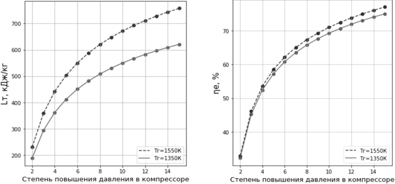 Удельная работа турбины зависит от температуры в камере сгорания и степени повышения давления в компрессоре. Также будет увеличиваться и КПД установки. На рис. 4 построены графические зависимости удельной работы турбины электрогенератора (4) и КПД установки (5) для температуры перед турбиной ТГ =1350 К и ТГ=1550 К.