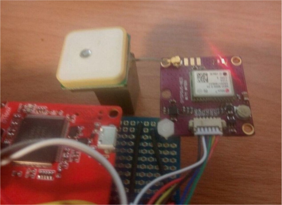Подключение GPS-модуля к процессору АП МС ДП выполняется через выход передатчика модуля (TXD) ко входу приемника процессора (P3.3/RX) и вход приемника модуля (RXD) к выходу передатчика процессора (P3.2/TX). Рабочее напряжение должно находиться в диапазоне 3.35 В, подключается питание через разъемы J1 и J3 (первый пин). Общий провод (заземление) подключается к разъемам J2 (20 пин) и J3 (22 пин) соответственно. Для передачи данных используется выход передатчика TXD, который подключается к разъему P3.3 на вход приемника (процессора) RX. Вход приемника RXD подключается к разъему P3.2 на выход передатчика TX. На рис. 7 показан опытный образец с GPS-модулем, подключенным к общей плате, демонстрирующий физическую реализацию всех соединений, корректное расположение компонентов на общей плате, а также практическую реализацию описанной схемы подключения.