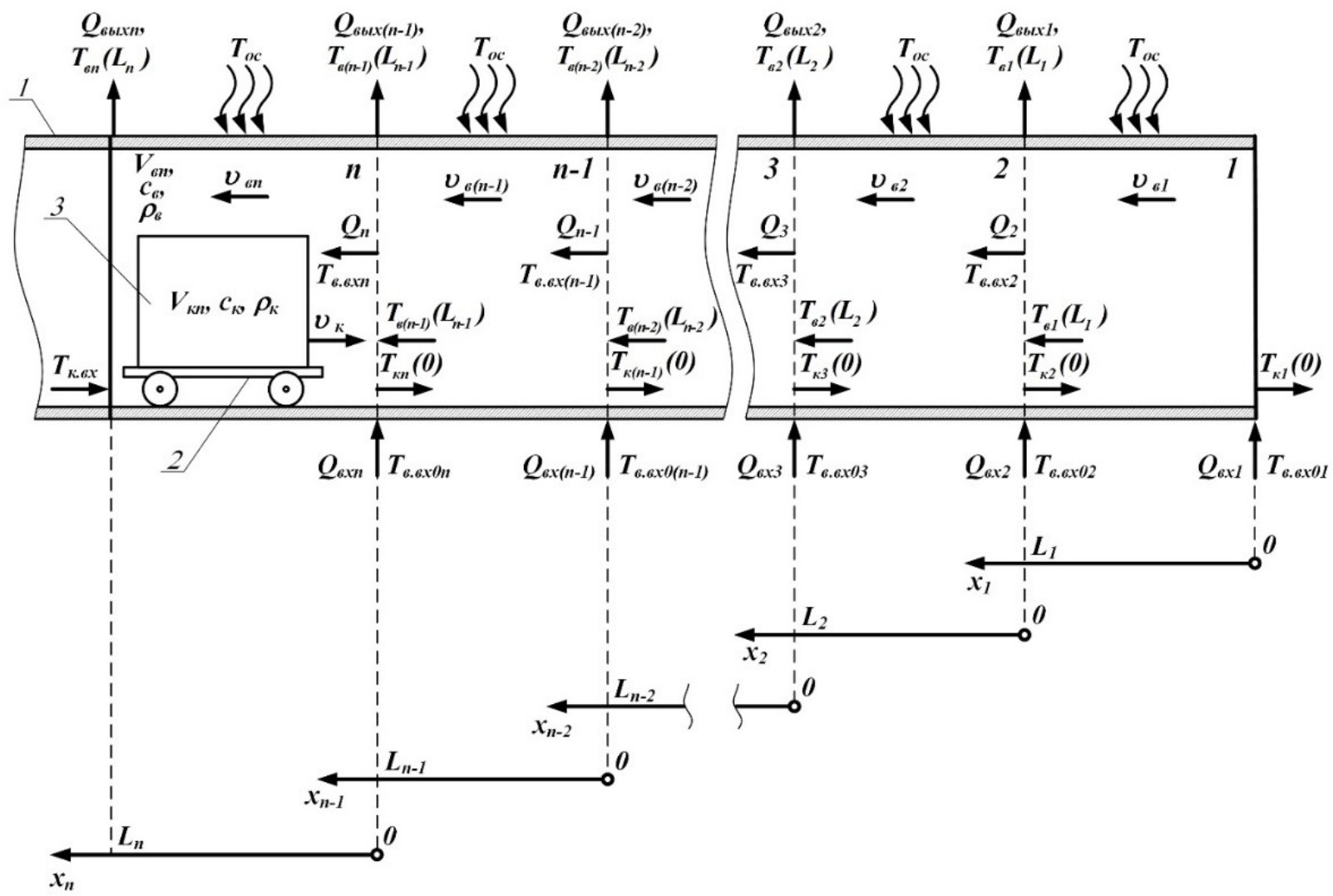Проведем анализ технологического процесса охлаждения керамического кирпича в туннельной печи как объекта управления. Туннельная печь представляет собой длинный канал 1, по которому движутся вагонетки 2 с кирпичом 3 (рис. 1). Изделия на вагонетке проходят от одного до другого конца канала, последовательно подвергаясь предварительному подогреву, обжигу и охлаждению в соответствующих зонах. В зону охлаждения кирпич попадает после зоны обжига, при этом охлаждающий агент (воздух) движется ему навстречу со стороны выхода изделий из печи, то есть рассматриваемая зона работает по принципу противотока. В дальнейшем будем считать, что в общем случае охлаждающий воздух подается в n точках, распределенных по длине зоны охлаждения, что делит ее на n участков. При этом в конце каждого участка присутствует также отбор воздуха, нагретого в процессе охлаждения кирпича. Такая распределенная подача и отбор охлаждающего агента открывают дополнительные возможности с точки зрения повышения гибкости и показателей качества управления процессом.