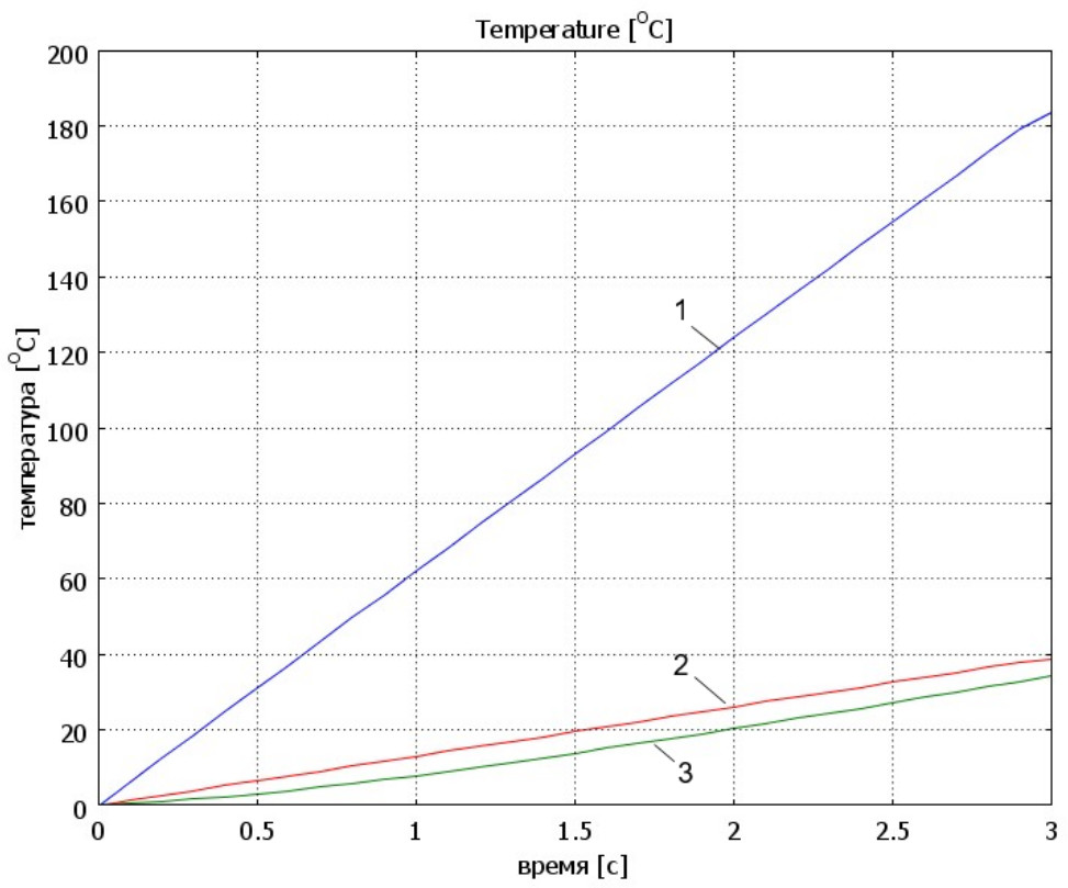 Рис. 5. Графики температуры при нагреве током 31.5 кА в точках заземлителя: 1 - поверхность вала; 2 - точка на линии между подвижным и неподвижным контактами; 3 - точка в месте подвода внешних шин