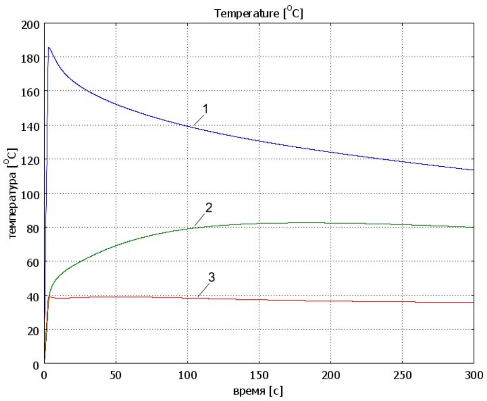 Представленные на рис. 5 графики температуры в наиболее важных точках (контакты) показывают допустимые значения. Нужно сделать уточнение, что при расчете не учитывалось наличие переходного сопротивления контактов, которое может существенно повлиять на уровень температуры в месте контакта.
