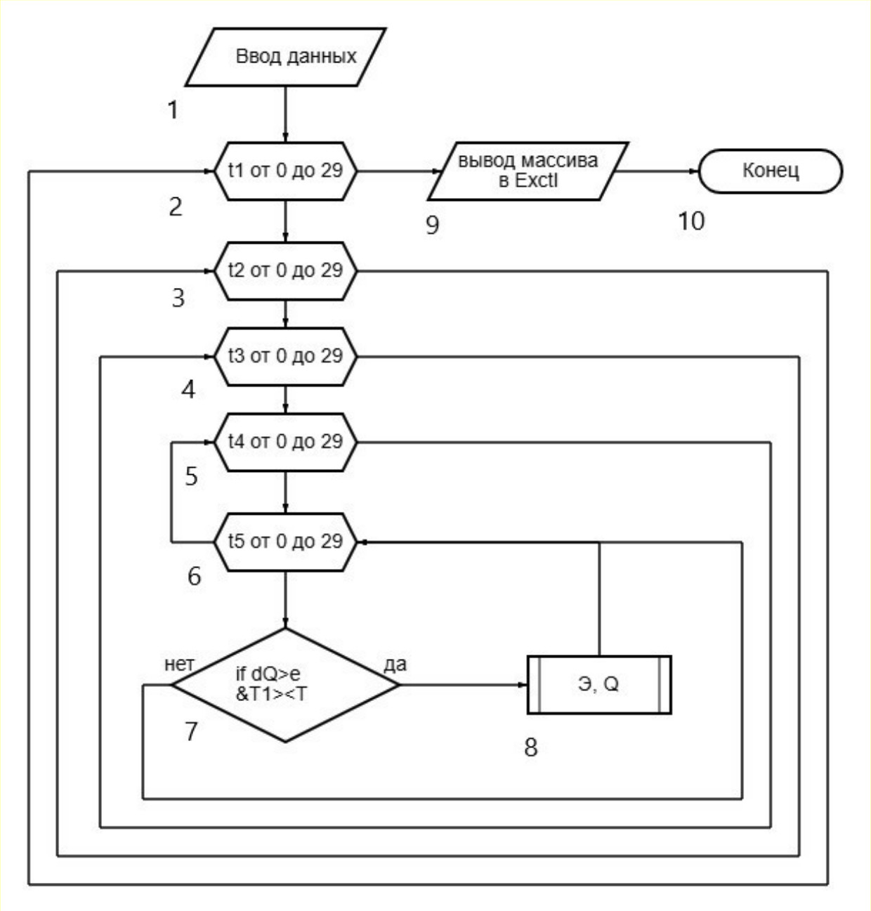 Рис. 1. Алгоритм метода упорядоченного перебора: 1 - блок ввода исходных данных и констант; 2…6 - вложенные циклы перебора всех возможных сочетаний периодов работы каждого технологического цикла; 7 - проверка ограничения по отклонению суммарной производительности от заданного значения и проверка условия (6), в случае нарушения одного из этих ограничений вариант отклоняется и расчет переходит к следующему варианту; 8 - подпрограмма расчета потребного месячного энергопотребления Э, кВт·час; 9 - вывод массива расчетных данных в Excel для дальнейшей обработки