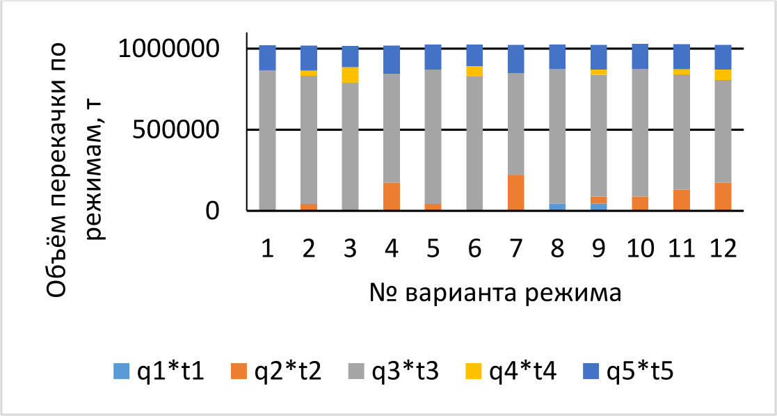 На диаграмме рис. 2 в виде столбцов с накоплением показана структура перекачки для первых 12 вариантов режимов. Каждая часть столбца соответствует номеру режима (с 1 по 5 снизу вверх) в сутках, умноженному на мощность соответствующего режима. Весь столбец соответствует месячному объему перекачки для заданного варианта.