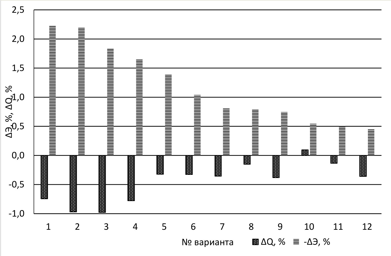 На диаграмме рис. 3 показано соотношение экономии электроэнергии для рассматриваемых режимов ΔЭ % и величины дефицита/профицита прокачанной нефти ΔQ %.
