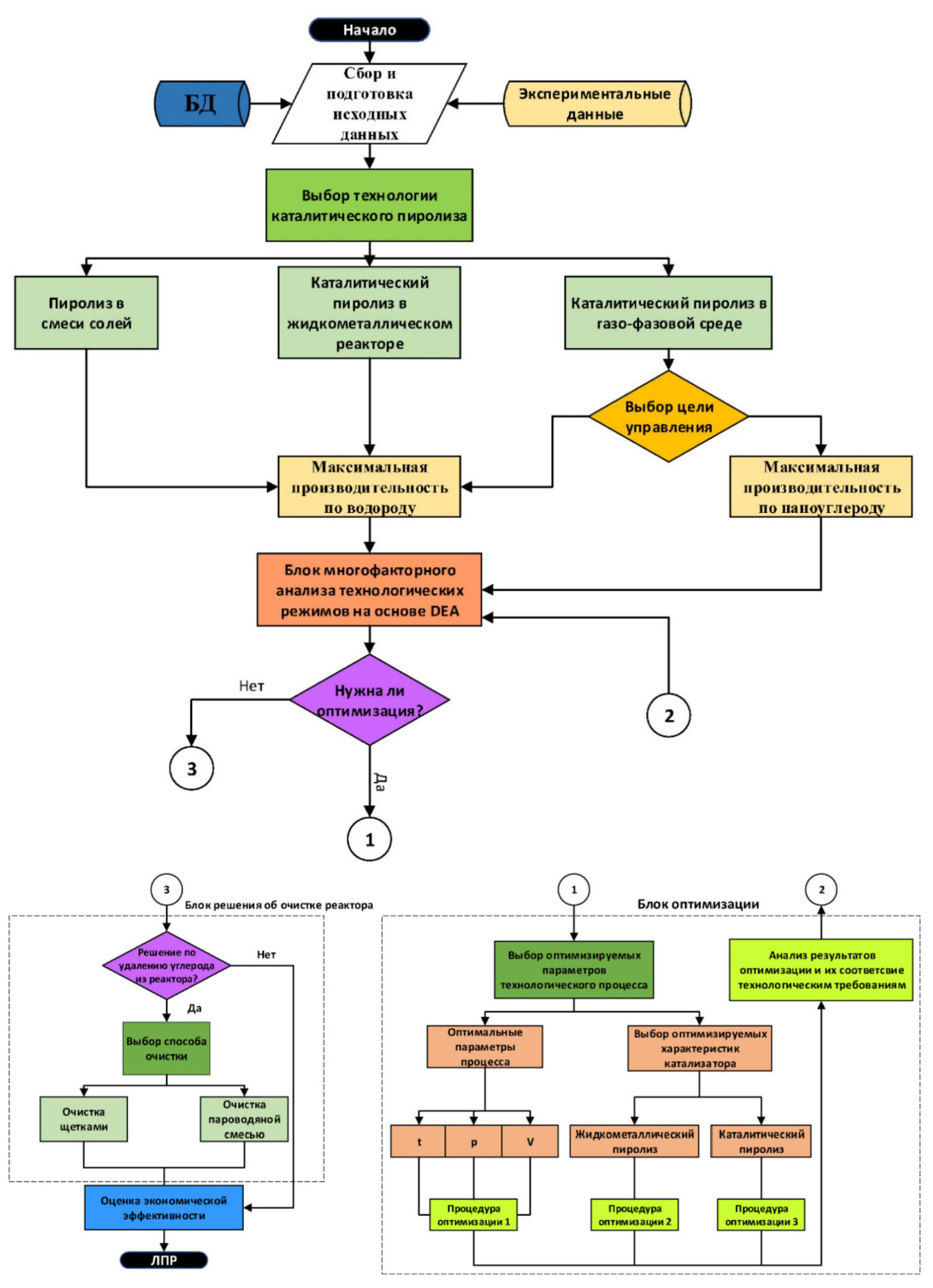 Блок очистки реактора от углеродных отложений предназначен для анализа состояния реактора и формирования сигналов о необходимости удаления углеродных отложений, которые могут накапливаться на стенках реактора, поверхности катализатора или в жидкометаллической среде. Подобные отложения приводят к снижению эффективности процесса и могут вызывать загрязнение системы. Перед принятием решения о проведении очистки в данном блоке осуществляется сбор и анализ данных о степени коксообразования и состоянии катализатора, включая информацию, получаемую на основе показаний газоанализатора. Если на основе проведенного анализа установлена необходимость удаления углерода, система формирует рекомендации по выбору методов очистки, предлагая механические или химические подходы, каждый из которых обладает своими технологическими преимуществами и ограничениями. Таким образом, блок формирует рекомендации по своевременному вмешательству в технологический процесс, предоставляя обоснованный выбор способа очистки в зависимости от характера отложений и состояния оборудования.