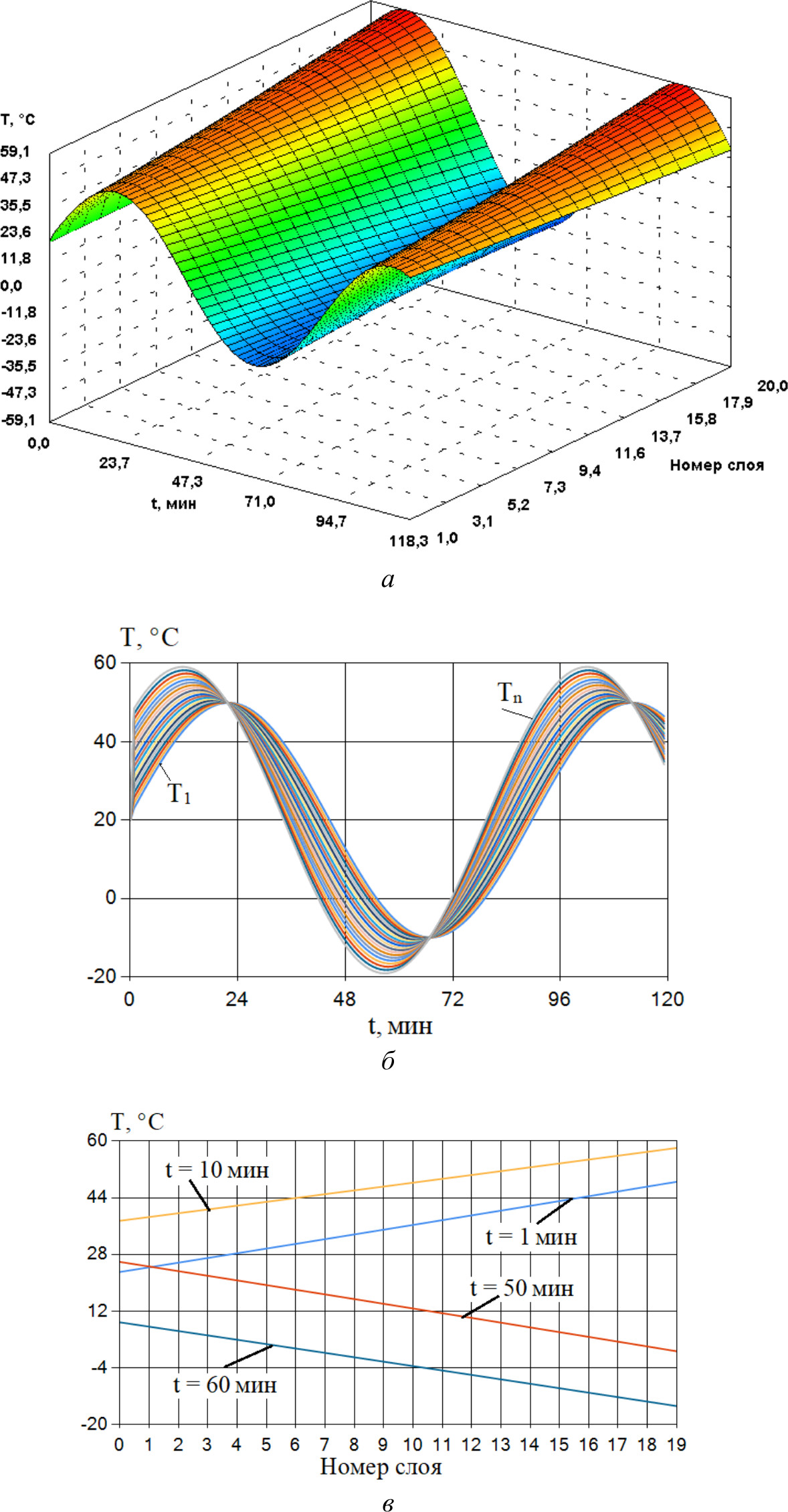 Рис. 4. Диаграмма изменения температур слоев во времени (а), температуры слоев волокна (б); графики температур в радиальном направлении в некоторые фиксированные моменты времени (в)