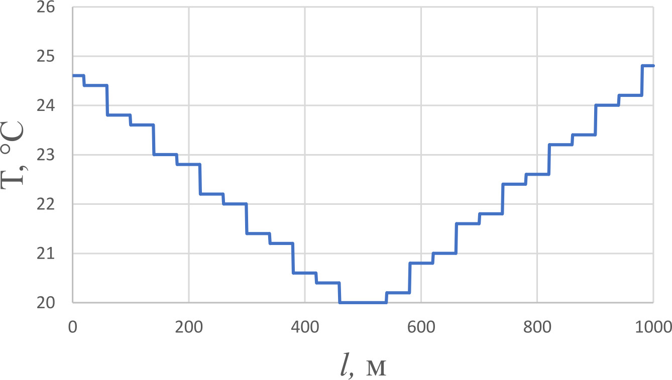 Полученный график иллюстрирует распределение температуры вдоль нити волокна при температурном градиенте в радиальном направлении для конкретных параметров катушки и оптического волокна.