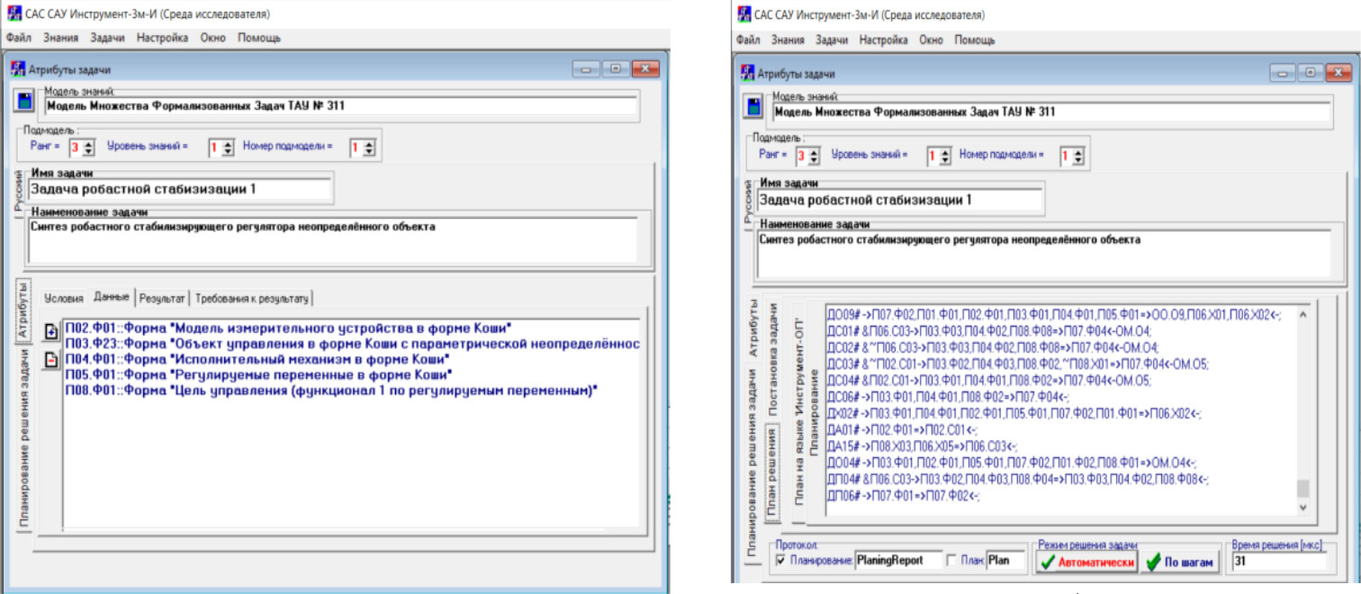 В задачах синтеза систем управления объектами с параметрической неопределенностью одной из проблем является необходимость учета возможных отклонений неопределенных параметров от их номинальных значений. Отличительной особенностью неопределенных динамических систем с неопределенными параметрами является стационарность их неизвестных параметров. Таким образом, параметры системы являются неизвестными, однако постоянными, т. е. не изменяются во времени. Однако не существует общего, единого подхода (метода) решения задач управления в условиях неопределенности. Проблема выбора метода решения задачи синтеза закона управления осложняется не только их многообразием, но и недостаточной осведомленностью инженера-проектировщика в бурно развивающейся теории автоматического управления. Использование средств автоматического решения непроцедурно поставленных задач, т. е. без указания метода их решения, не допускается практически ни в одной из современных САПР САУ. Это обусловлено необходимостью создания модели знаний проблемной области задач ТАУ, на которой ставятся и решаются задачи. Также это инициируется принципиальными проблемами планирования действий по их решению. Важнейшей из них является то, что большинство методов ТАУ синтеза и анализа САУ являются итерационными. К сожалению, проблема автоматического синтеза циклических программ не имеет массового (общего) решения в связи с бесконечным разнообразием возможных алгоритмических схем реализации итерационного процесса, реализуемого порождаемой программой [4]. Таким образом, универсального подхода к планированию действий для решения декларативно поставленных задач не существует [5–9]. Для определенного достаточно узкого класса задач может быть определена некая обобщенная структура плана действий по решению задач этого конкретного класса, например с использованием крупноблочного, структурного, концептуального [5–9] подходов. В частности, возможно построение циклических планов решения некоторого класса задач итерационными методами, допускающими представление тела цикла в виде монолитного блока [4]. Нарастающая потребность в построении новых САУ для новых слабо изученных объектов управления в условиях ужесточения требований к затратам как времени, так и ресурсов на разработку и освоение производства требует решения указанной проблемы. Поэтому все более востребованными становятся методы решения задач синтеза и анализа САУ в условиях неопределенности, слабо чувствительных к изменениям параметров объекта, робастных законов стабилизации и управления. Настоящая статья посвящена изложению подхода к автоматизации решения задач синтеза и анализа САУ методами построения робастных законов стабилизации. Методы синтеза робастного управления предусматривают итерационные процессы выполнения ряда подзадач, которые должны составить основной цикл порождаемой циклической программы. При этом необходим способ выделения среди действий, необходимых для решения исходной декларативно поставленной задачи, действий, выполняемых итерационно в цикле, в отличие от остальных действий, выполняемых лишь однократно. Известные методы представления знаний и планирования действий по решению задач [5–13], как прямой [10], так и обратный методы [12], позволяют выстраивать лишь 