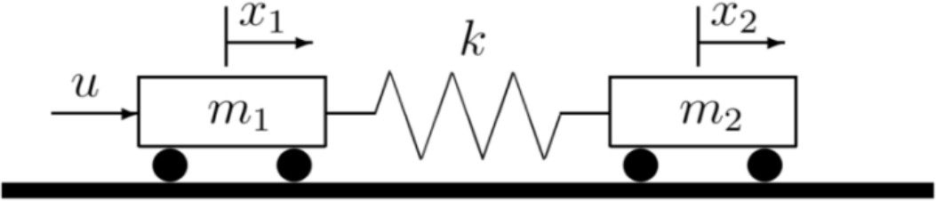 Рассмотрим в качестве объекта управления двухмассовую систему [20] из двух твердых тел с массами и , соединенных пружиной с коэффициентом упругости k, скользящих без трения вдоль неподвижного горизонтального стержня (рис. 3). К левому телу приложено управление, призванное стабилизировать колебательную систему.