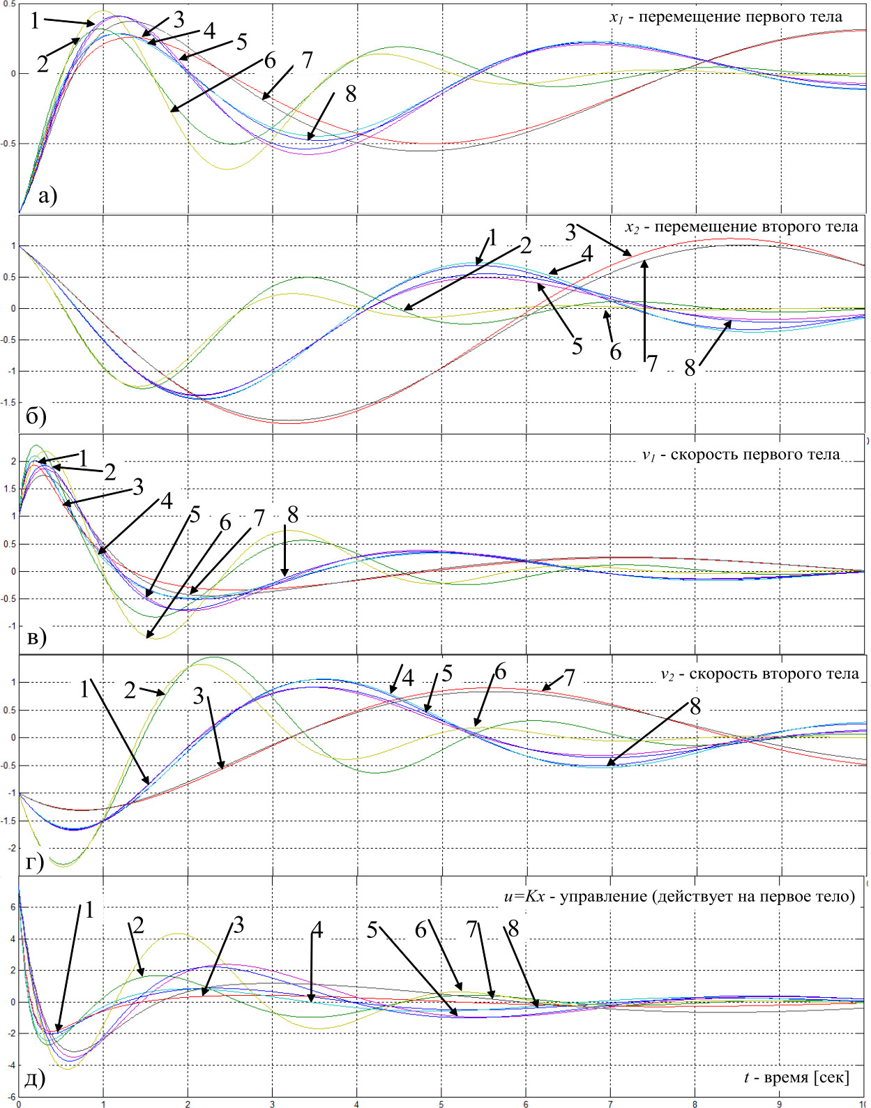 Рис. 4. Графики переходных процессов по переменным состояния a–г и управлению д в системе (21), (24–26), возбужденных начальными условиями (22) по результатам первой итерации цикла итеративного процесса решения задачи