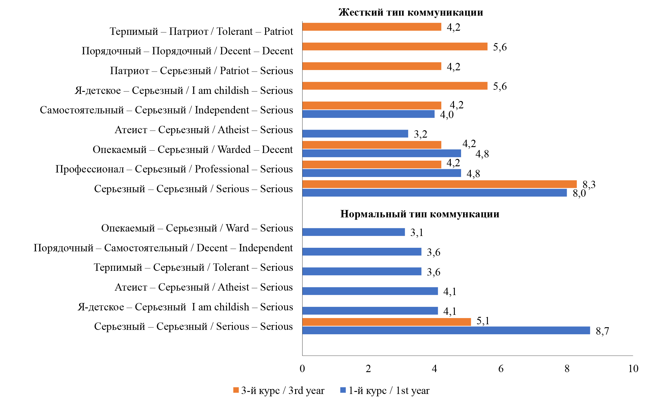 В условиях межличностной коммуникации преобладающая часть студентов 1-го (62,54 %) и 3-го курсов (66,96 %) предпочитает направленность сознания на другого, характеризуемая как субъект-субъектная: серьезный – серьезный, самостоятельный – серьезный, порядочный – серьезный, профессионал – серьезный, патриот – серьезный. Однако на 3-м курсе увеличивается доля студентов с такой направленностью, а список значимых ролей становится разнообразнее. В ролевой прагматике студентов 1-го курса не придается значение сочетанию характеристик «серьезный – терпимый», «профессионал – атеист», «нетерпимый – серьезный», «нетерпимый – серьезный», «порядочный – порядочный», «терпимый – патриот». На 3-м курсе сокращается доля объект-субъектного взаимодействия (с 18,83 % до 13,83 %) и сужается перечень значимых ролей: сохраняют значимость роли «Я-детское – серьезный» (выросло число выборов с 6,50 % до 8,48 %) и «опекаемый – серьезный» (снизилось количество выборов с 7,88 % до 4,17 %), теряют актуальность «опекаемый – порядочный».