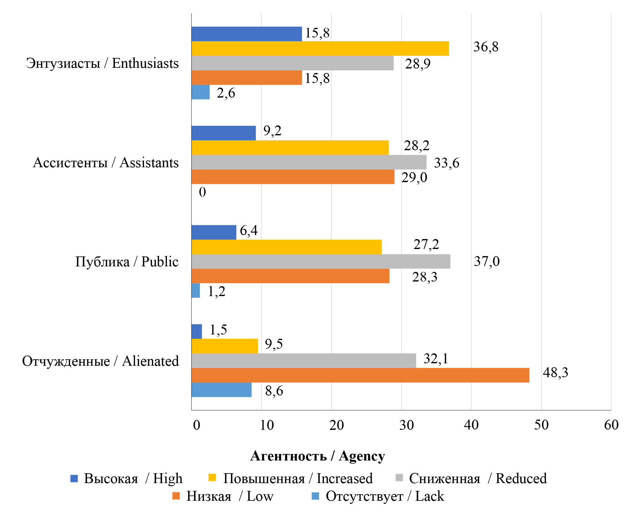 Уровень вовлеченности демонстрирует статистически значимую связь с уровнем агентности: корреляция средней силы (ρ = 0,358; p < 0,01). Общая доля школьников категории «Публика» с повышенным и высоким уровнем агентности составляет 33,6 %, среди «Энтузиастов» – 52,6 % (рис. 1).