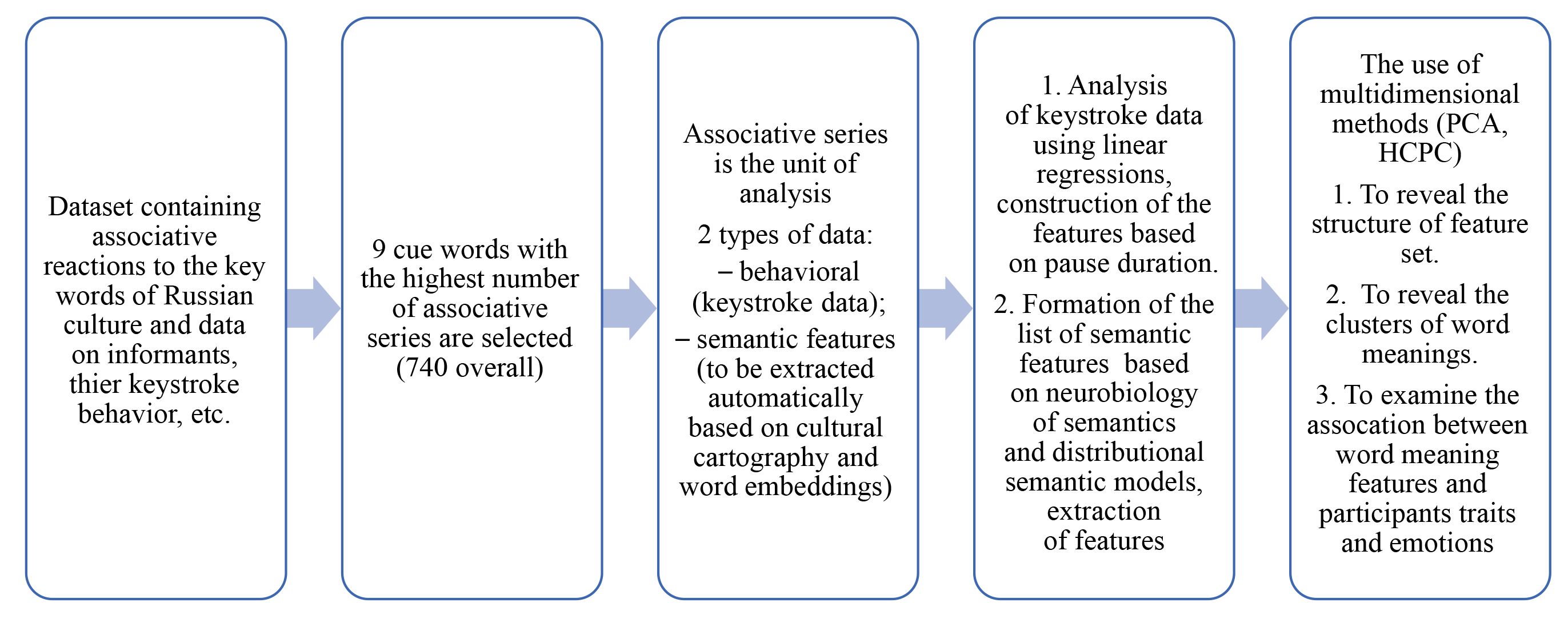 Materials and Methods. The material of the study is a newly developed dataset containing associative reactions to the keywords of Russian culture, anonymized data about the informants, as well as the reaction time while producing associations measured using a program that records keystrokes. The proposed research methodology includes both the existing approaches (automatic extraction of relations from texts based on data from language models and methods of vector semantics, i.e., “cultural cartography using word embeddings”) and a new list of features developed by the authors to describe individual differences in the meaning of a word based on the data from neurobiology about the meaning structure of word. A set of data analysis methods (linear mixed models, principal components analysis, hierarchical clustering on principal components) implemented in R packages is used to reveal individual differences in the word meaning in terms of the proposed list of features and association of the revealed differences with participants’ characteristics.