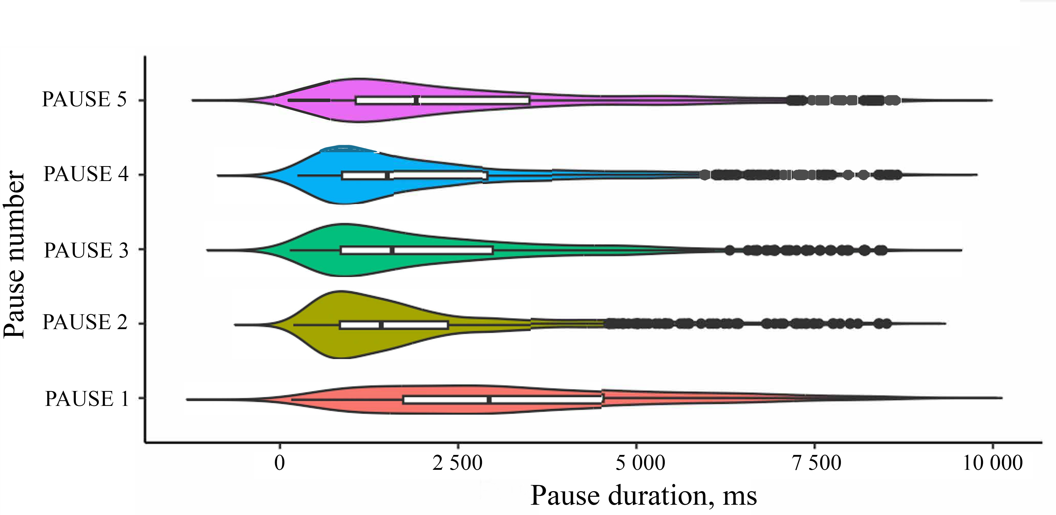 Pause Behavior during Word Association Production. As Fig. 2 shows, there are differences in pauses duration depending on the pause location (i.e., between a cue word and the first reaction – PAUSE 1, the second reaction – PAUSE 2, etc.). To test these differences for their significance, we performed the Kruskal–Wallis test which proved the difference between the durations of pauses depending on their positions (Kruskal–Wallis chi-squared = 242.96; df = 4; p-value < 2.2e- 16). Pairwise Wilcoxon signed rank comparisons with Bonferroni correction shown the differences between the duration of the PAUSE 1 and other pauses, PAUSE 5 and other pauses (there were no differences in duration between PAUSE 2 and PAUSE 3, PAUSE 3 and PAUSE 4, PAUSE 2 and PAUSE 4), with the first pause (i.e., between a cue word and the first associate) being the longest one.