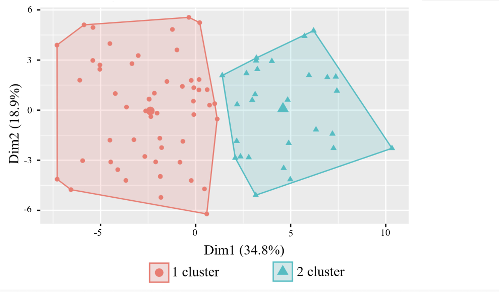 At the second stage, we performed clustering on the components (Fig. 3). The criterion “gain of inertia” suggests two-cluster solution. Cluster division is associated with gender (p-value of the chi-square test = 0.0012).