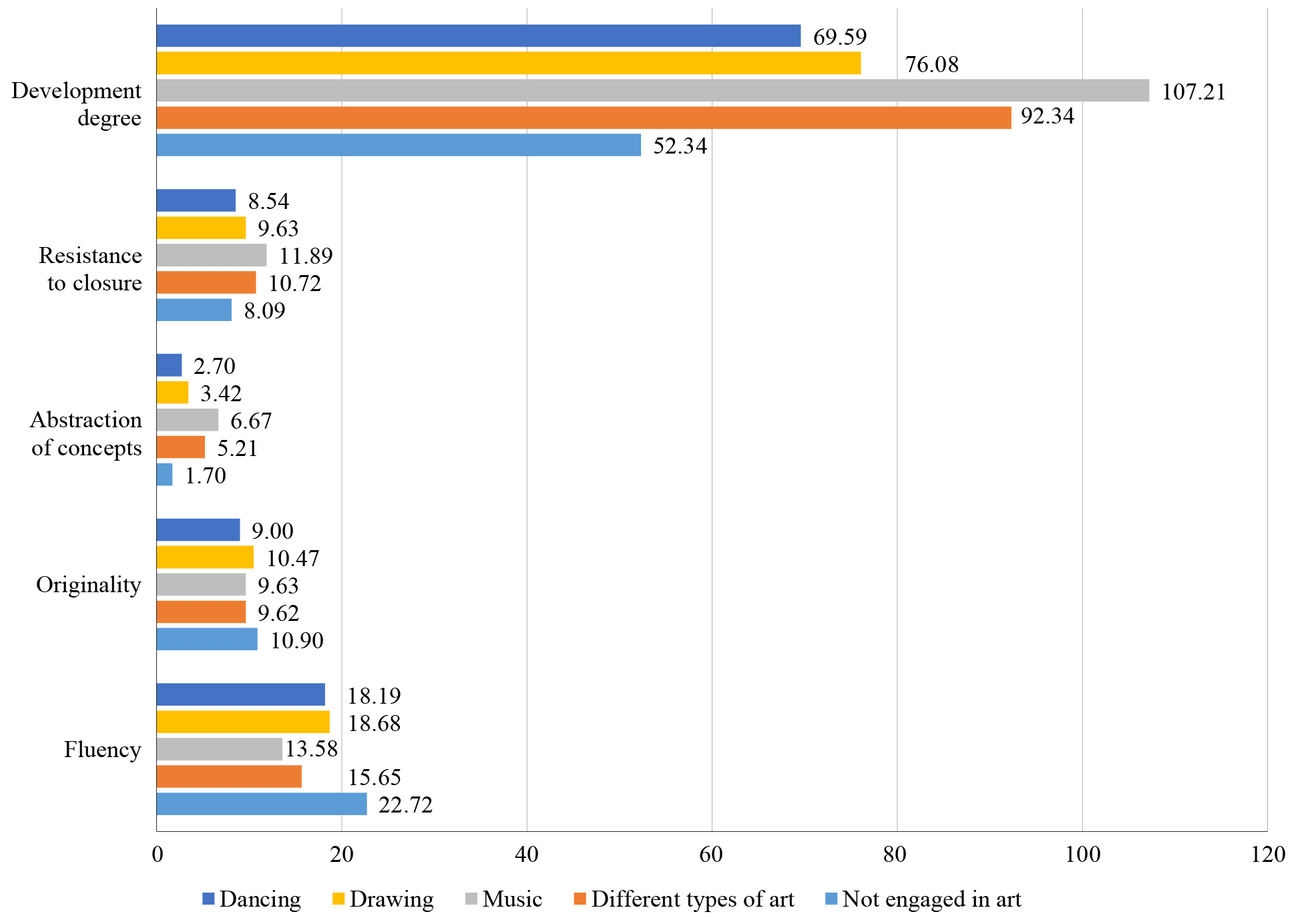 The study showed that children who were engaged in art had higher results on the development degree, resistance to closure, and abstraction of concepts than the children who were not engaged in art. However, on the originality and fluency scales, the values were higher in the children who were not engaged in art. To clarify the data, we examined the differences in indicators depending on the type of art in which children were involved (figure).