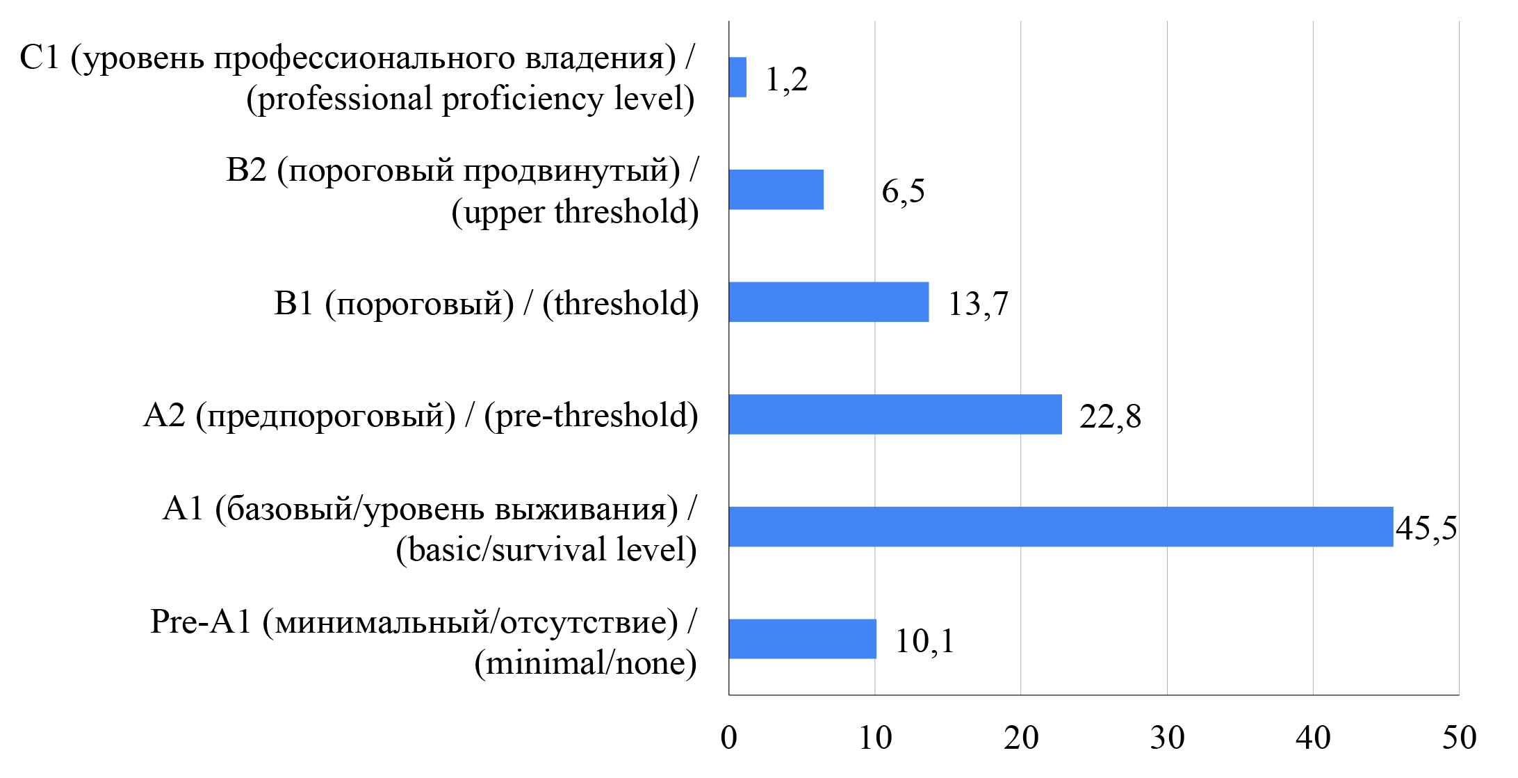 Р и с. 1. Распределение уровней владения английским языком среди респондентов, %