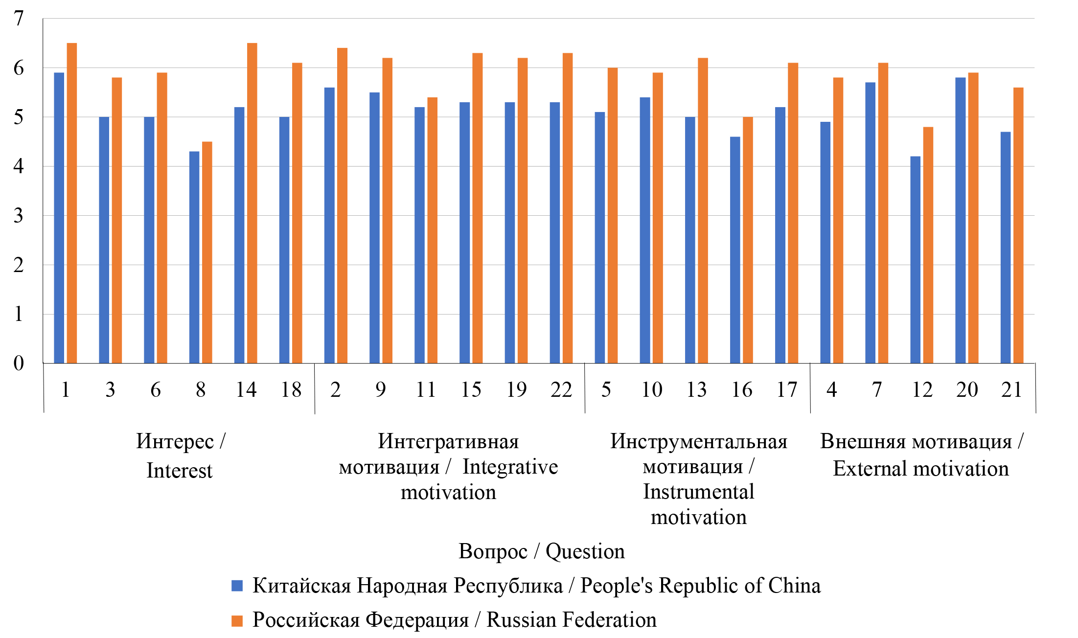 Анализ интереса студентов к иностранным языкам, отношения к русскому языку и его изучению с помощью теста-опросника Р. Гарднера дал следующие результаты: средний показатель среди респондентов, получающих образование в России, составил 5,93, в Китае, – 5,07 (k = 1,17).