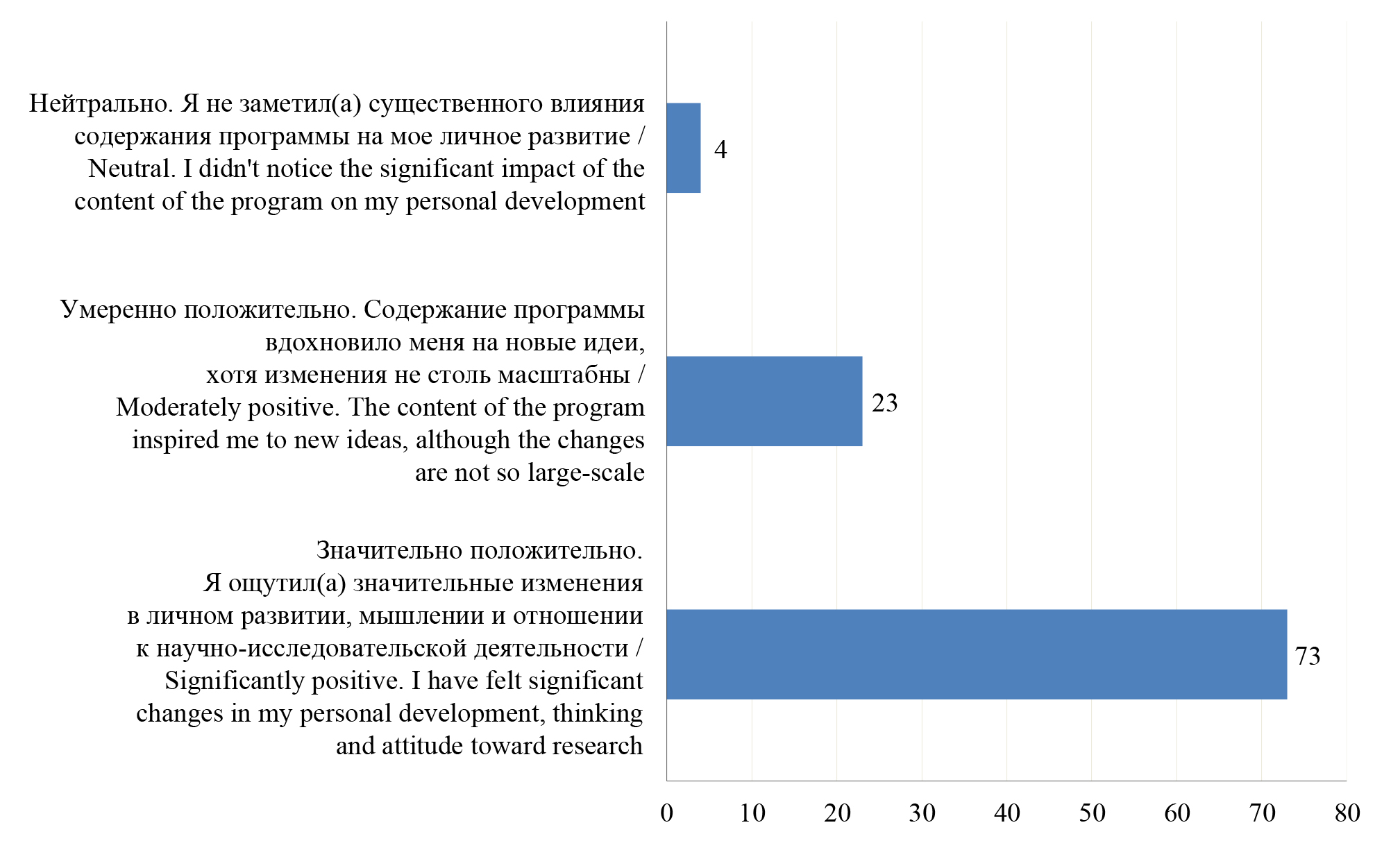 Results. The results of the survey allowed us to obtain qualitative data on the dynamics of motivation and research activity of students. The results obtained confirm that specially organized conditions of subject-subject interaction contribute to the active development of participants’ self-awareness. It is revealed that the included interaction between teachers and learners activates the desire of the latter to get engaged in science. Owing to the organization of conditions for active self-reflection, the program participants realized their capabilities and their boundaries, forming an understanding of their claims to their personal trajectory of self-development, future profession, increased motivation to develop a sense of personality and civic identity.