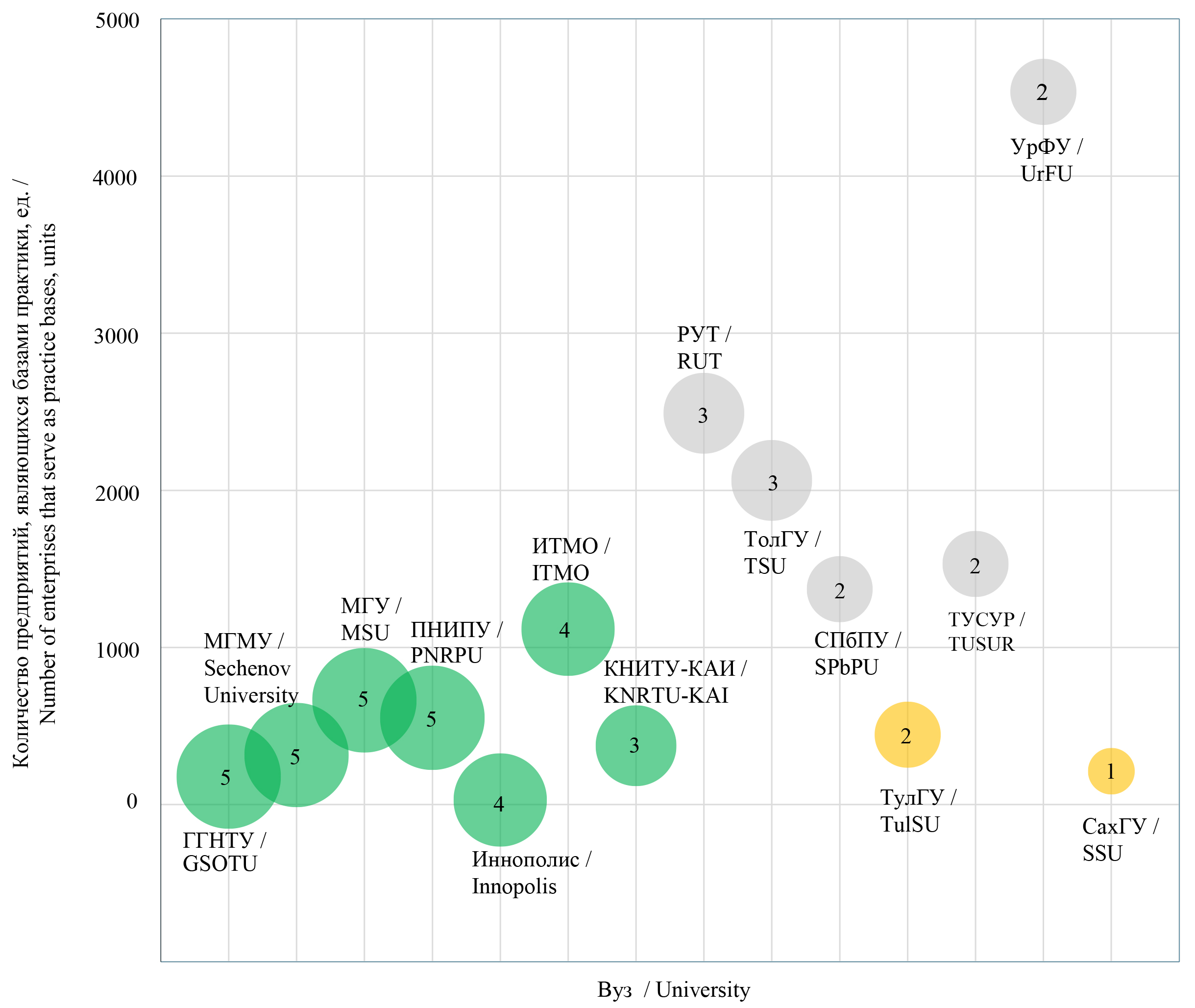 Графический анализ показал, что вузы с адаптированным проектным обучением под технологические процессы развития инноваций (МГУ, ПНИПУ, МГМУ, ГГНТУ) имеют небольшую сеть партнерств. Косвенно это может быть связано с малой численностью студентов ПИШ. Учебным заведениям с небольшим количеством баз практик легче фокусироваться на отдельной образовательной программе и организовывать непосредственное взаимодействие студентов и индустриальных партнеров для развития инженерных кадров с опережающей подготовкой: чем больше партнерская сеть вуза, тем более финансово затратно ему организовывать сотрудничество студентов и индустриальных партнеров.