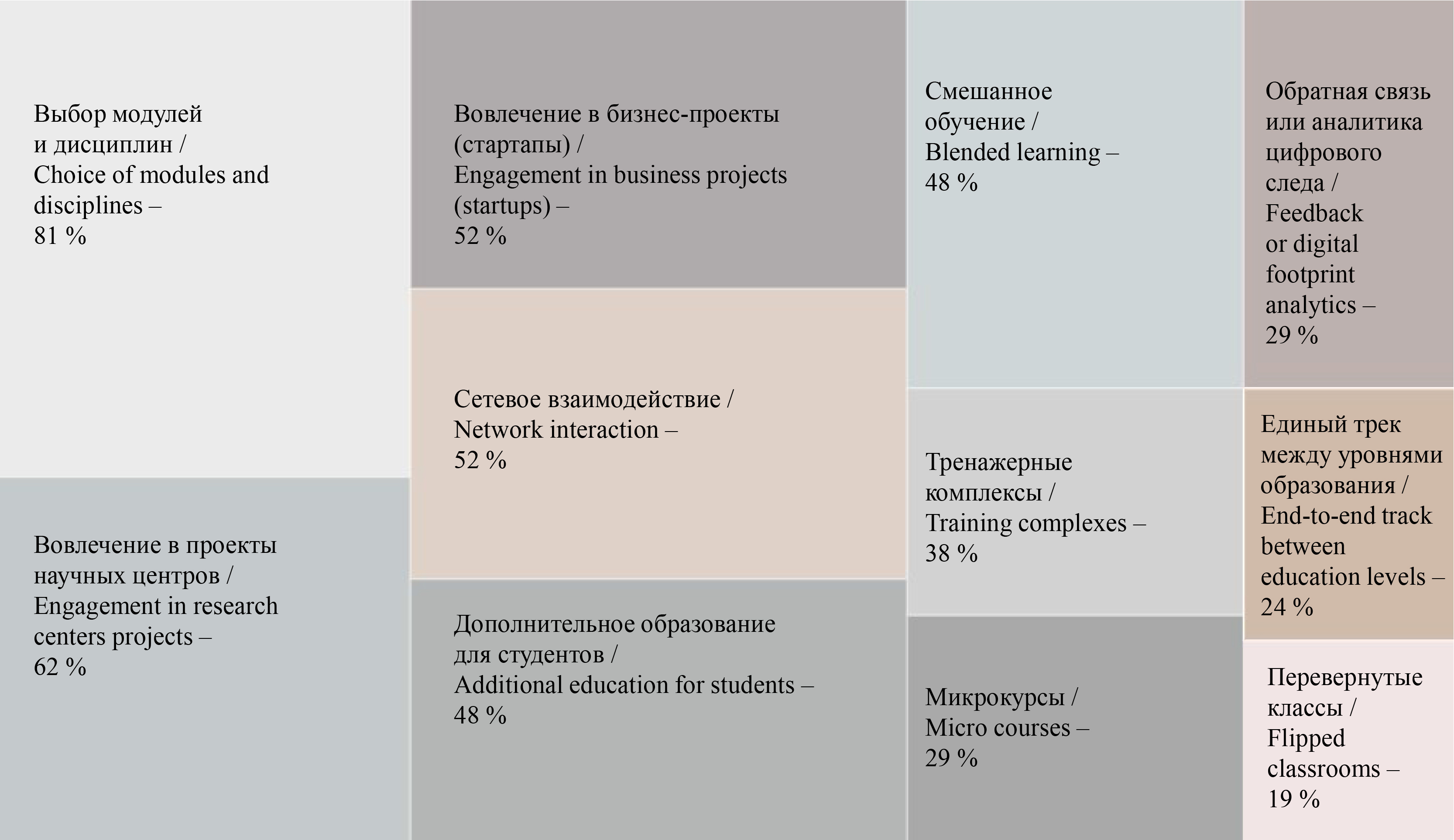 - Формировать у студентов ориентиры продолжения обучения после окончания вуза [33], что может быть реализовано за счет образовательных инструментов поддержания активности личности в освоении знаний для решения актуальных задач: выбора дисциплин, единых образовательных треков, микрокурсов, получения дополнительных квалификаций параллельно с высшим образованием.