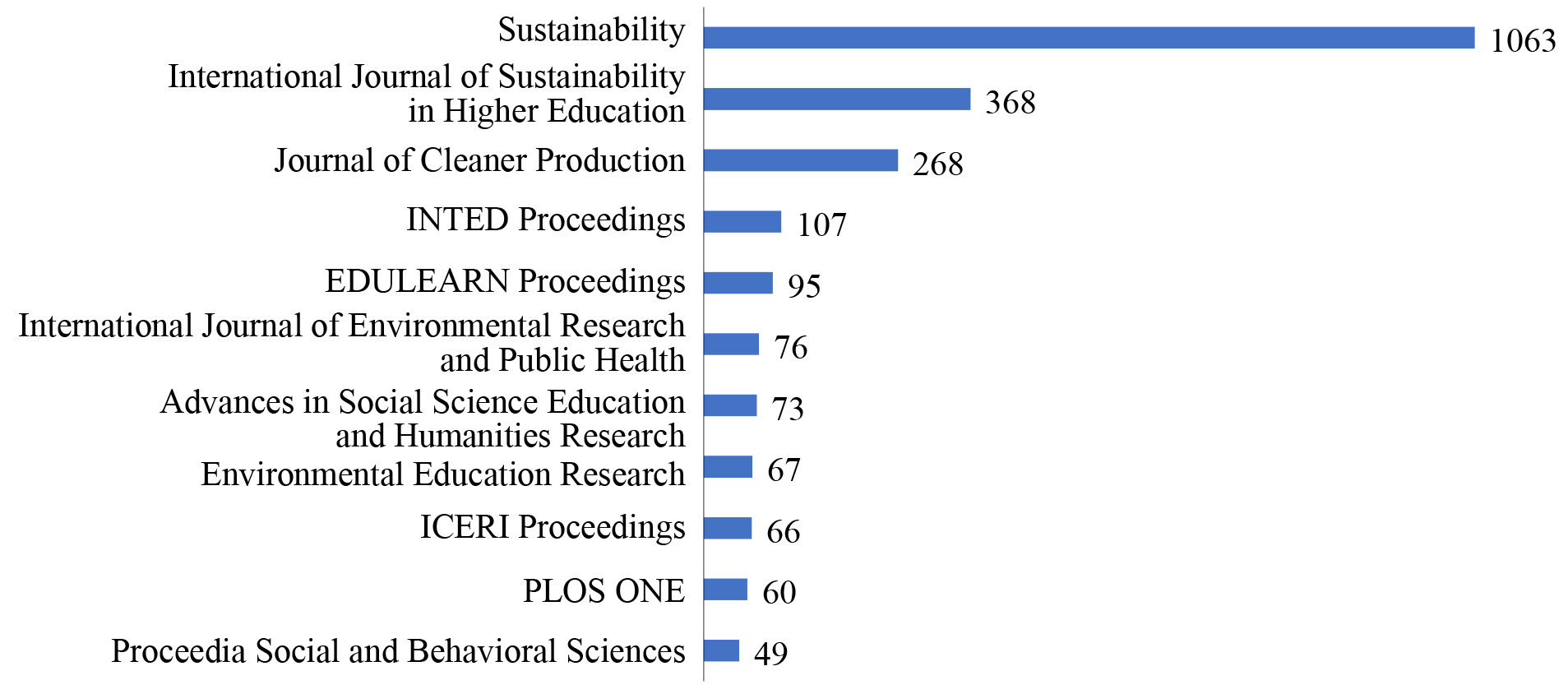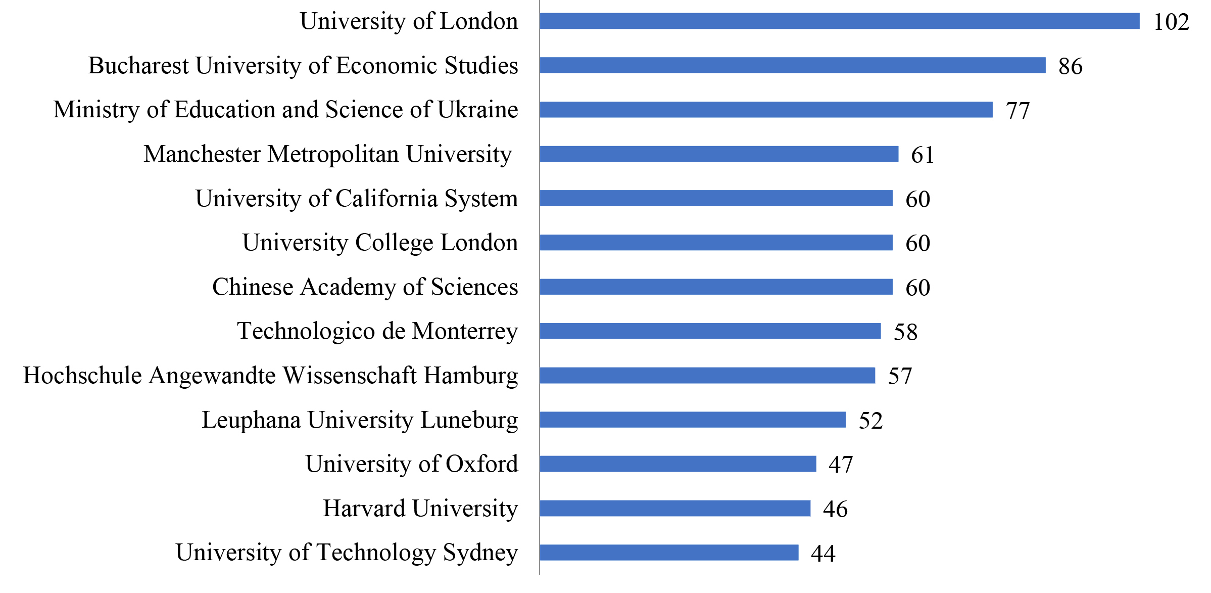 Figure 5 provides an account of the most prolific institutions producing publications on higher education and sustainable development between 2000 and 2024. One can see very prestigious institutions such as University of London, University of California, Chinese Academy of Sciences, University of Oxford, or Harvard University being among the top 13 ones.