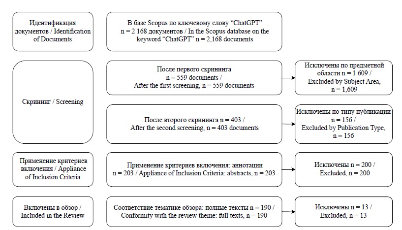 Поиск в МНБД Scopus по ключевому слову «ChatGPT» на 06.10.2023г. обнаружил 2168 документов. Применение фильтров «предметная область» (Social Sciences; Arts &Humanities) сократило количество документов до 559, а использование фильтра «тип публикации» (Article; Review) – до 403 документов.