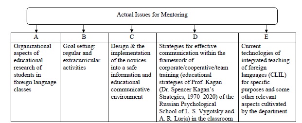 They are the goal setting of novices in the aspect of mentoring; the projective activities for the information environment; the education strategies for team training in the lens of Dr. Spencer Kagan’s strategies based on the culture-historical theory of L. S. Vygotsky and A. R. Lurja, the Russian psychological school in the classroom, and modern technologies of integrated teaching of foreign languages (CLIL) for specific purposes.