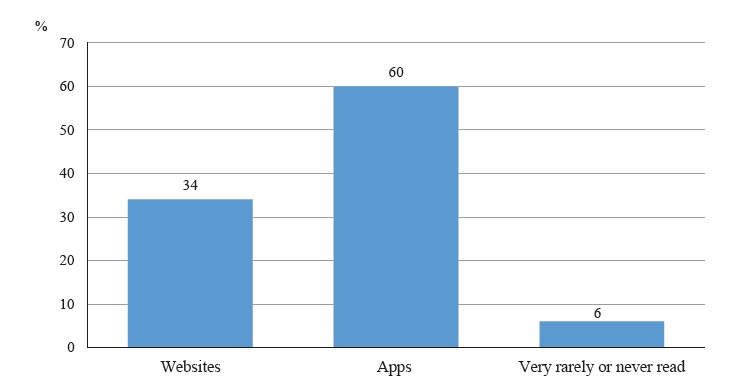 According to the survey, only 6% of minors very rarely or never read online novels due to a lack of time or interest, or they consider online literature to be superficial. By comparison, 34% of the minors read online novels on websites while 60% of them read through the WeChat or Weibo apps (Fig. 1).