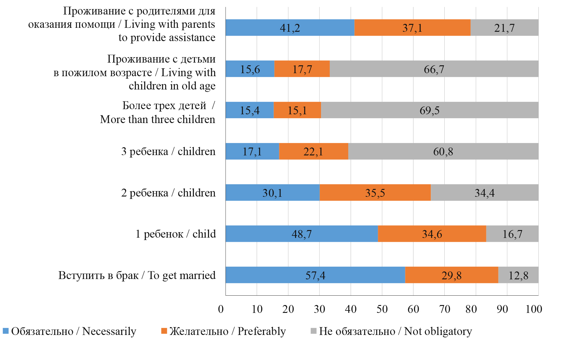 Семья – это важно, однако, что считать семьей и с кем ее заводить – дело каждого / Family is important, but what constitutes a family and who to have one with is up to each individual. | 39,6 | 31,1 | 32,8 |