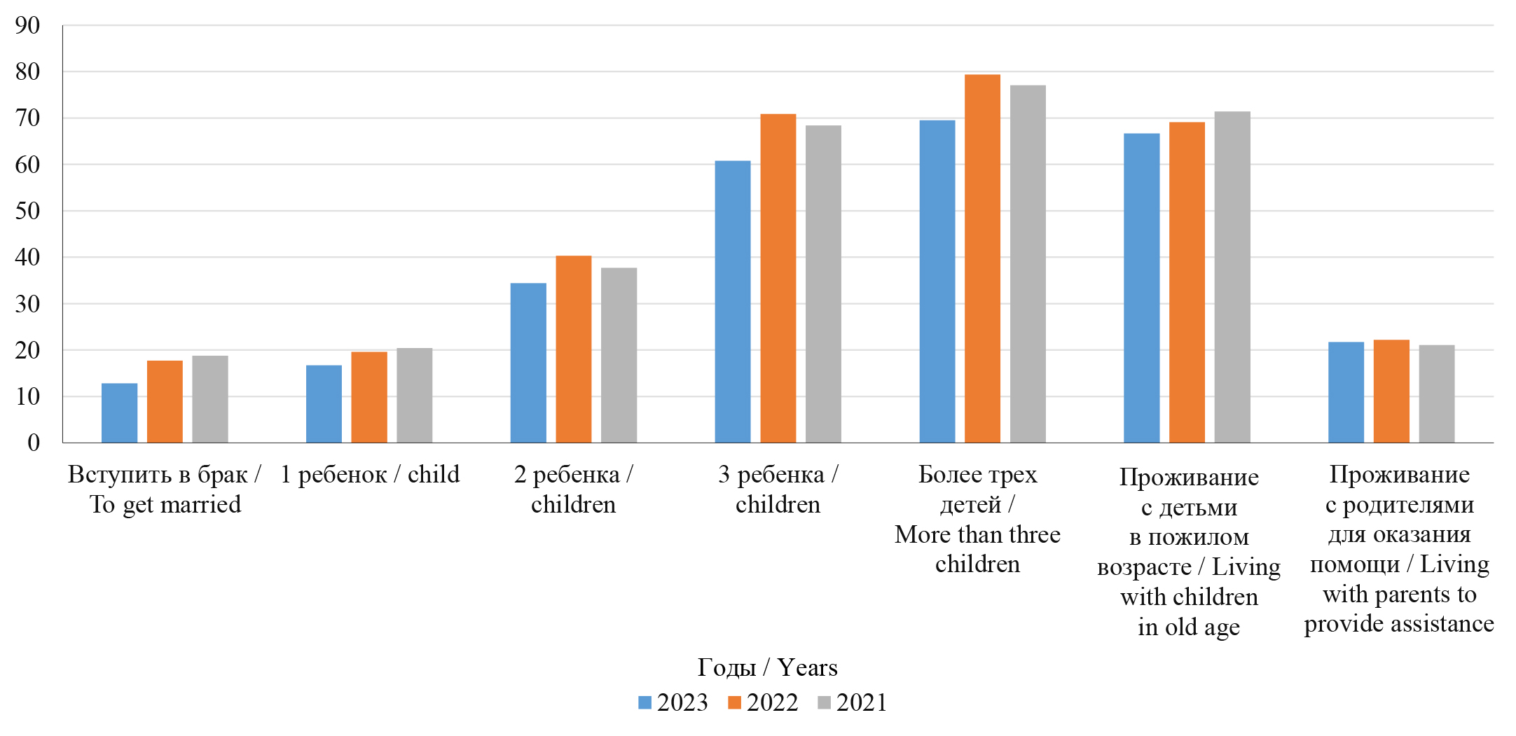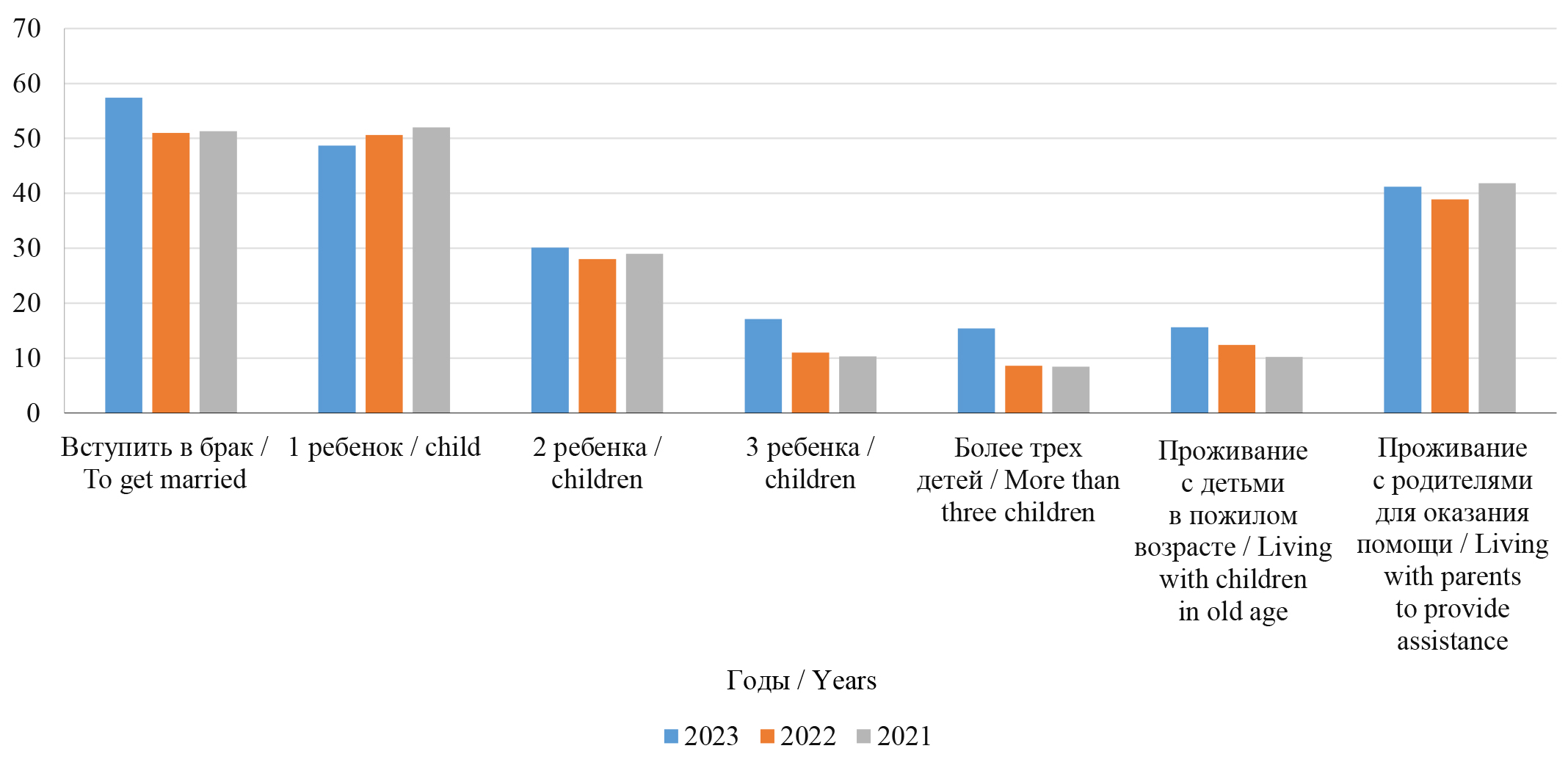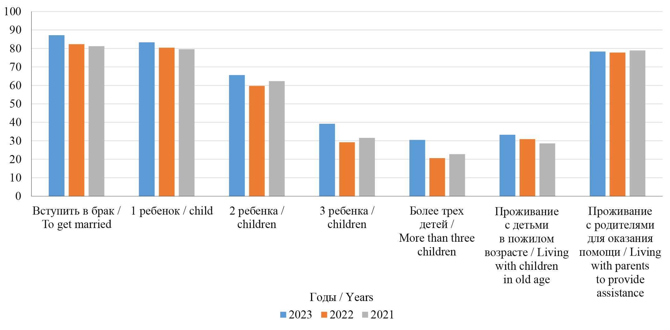 Имеются определенные изменения в стратегии построения расширенной семьи как одного из индикаторов развития семейного института. Так, положительный выбор в пользу проживания со своими детьми возрастает в 2023 г. почти на 5 % по сравнению с 2021 г. Неизменным остается выбор совместного проживания со своими родителями в период их старости (практически 80 %).