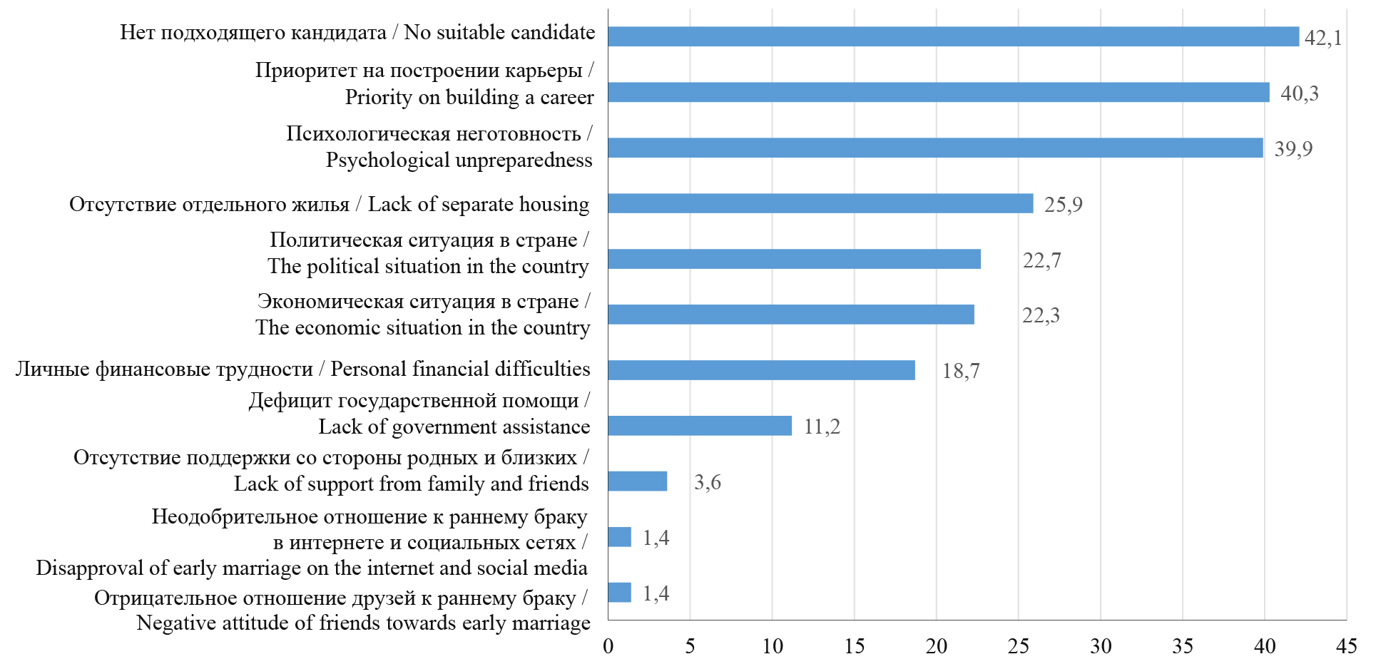 Во-вторых, гендерный ценностный разрыв: различие в матримониальных установках мужчин и женщин (преобладание традиционности среди мужчин против большей либеральности среди женщин) может создавать конфликт ожиданий в партнерских отношениях, осложнять процесс формирования семьи и повышать риск ее дестабилизации.