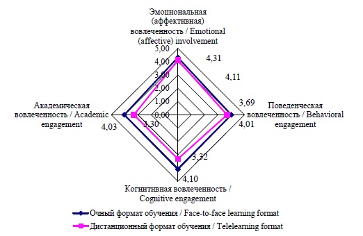 Уровень вовлеченности иностранных студентов в учебный процесс при очном и дистанционном форматах обучения оценивался по четырем группам критериев: эмоциональная (аффективная), поведенческая, когнитивная и академическая вовлеченность. При оценке обозначенного аспекта также применялась шкала Лайкерта, предполагающая оценку по пятибалльной шкале (от 1 балла – полностью не согласен до 5 баллов – полностью согласен), затем рассчитывалось среднее арифметическое значение уровня вовлеченности (рисунок).