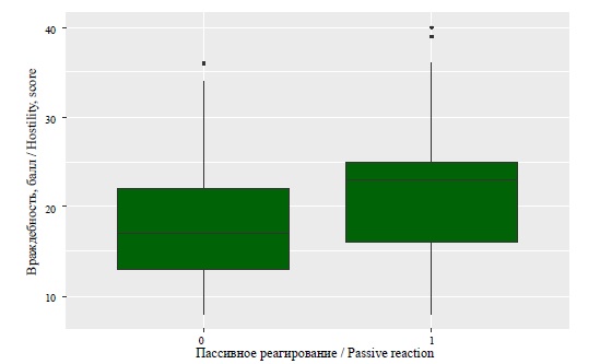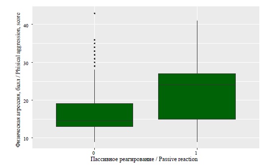 По параметру «физическая агрессия» обнаружены значимые различия в контексте выбора варианта «пассивное реагирование» по критериям Стьюдента (t = –13,329, df = 688,67, p < 0,01) и Манна – Уитни (W = 37981, p < 0,01). Респонденты, выбравшие вариант «пассивное реагирование», имеют статистически значимо более высокие показатели по рассматриваемой шкале (средние значения 16,2 (5,95) и 22,6 (7,45)) (рис. 2).
