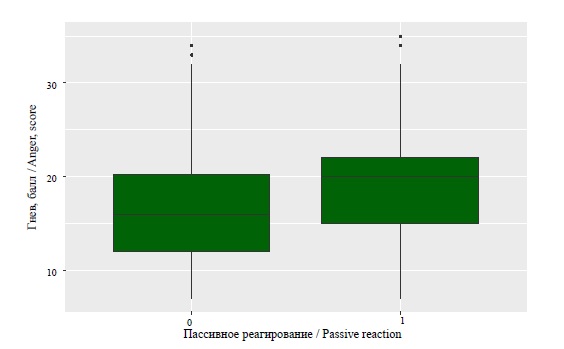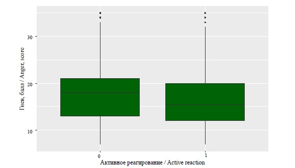 По параметру «гнев» были выявлены значимые различия в контексте выбора варианта «активное реагирование» по критериям Стьюдента (t = 3,6675, df = 1357,1, p < 0,01) и Манна – Уитни (W = 264050, p < 0,01). Респонденты, не выбравшие вариант «активное реагирование», имеют статистически значимо более высокие показатели по рассматриваемой шкале (средние значения 17,5 (5,75) и 16,4 (5,51)) (рис 3).