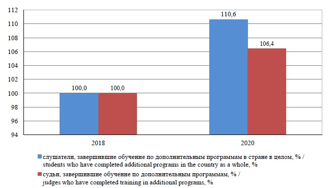 Вместе с тем процент роста количества судей, повысивших квалификацию, меньше, чем процент роста количества слушателей, завершивших обучение по дополнительным профессиональным образовательным программам в стране в целом за период с 2018 по 2020 г., что предопределяет большой круг задач в сфере организации непрерывного образования судей (рис. 2).