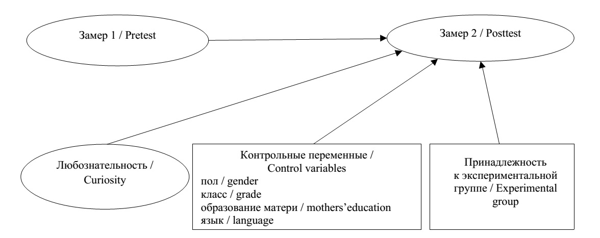Метод анализа. Для того чтобы оценить влияние попадания учащегося в экспериментальную группу на изменение его мотивации и самоэффективности в области естествознания в работе использовался метод структурного моделирования (Structural Equation Modelling). В экспериментальных дизайнах применение структурного моделирования имеет несколько преимуществ по сравнению с другими подходами (например, t-test или ANOVA) [52; 53]. С целью построения моделей использовалась программа Mplus 7.4 с применением параметра WLSMV и кластерной коррекцией по школам. Модели строились отдельно для каждого типа мотивации и самоэффективности по общей логике, представленной на рисунке. Качество моделей оценивалось с помощью уже традиционных для структурного моделирования критериев CFI и TLI (>0,9), RMSEA (<0,08)18.