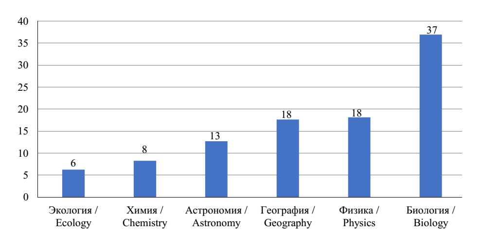Выбор онлайн-кружков. Отдельного внимания заслуживают данные о выборе предмета учащимися экспериментальной группы для занятий в онлайн-кружках (рис. 2). 37 % учащихся, получивших доступ к онлайн-платформе, выбрали на ближайшие два месяца курс по биологии, 6 % – заинтересовали курсы по экологии и 8 % – по химии.