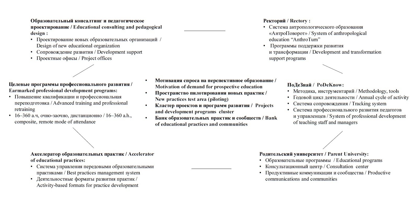 Discussion and Conclusion. The described approaches and implemented projects made an ecosystem of educational solutions. On the one hand, they provide support for the development of the professional and educational space and innovative activities of the subjects of Russia, the creation and dissemination of promising educational practices, training of high-level professionals for the social sphere, business; and, on the other hand, it contributes to the formation of a dynamic system for the implementation of continuous professional development of personnel.