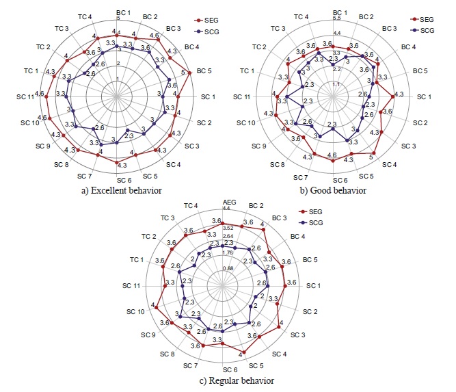 Multiple correlations are shown with two basic nuclei. A positive one is direct, such as the specific competency SC10. This nucleus indicates that it could be a guideline for curricular design with intradisciplinary nature and suitable for CAx.