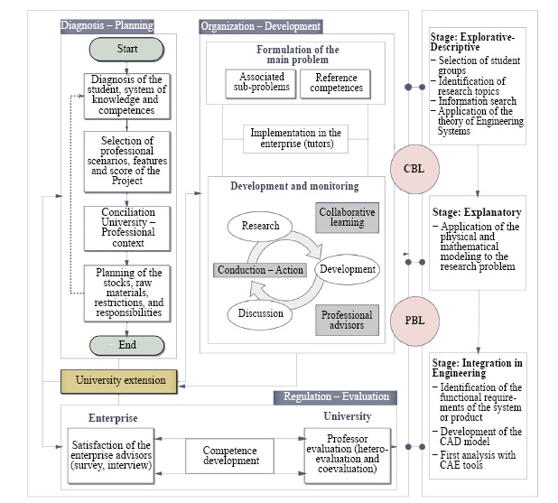 The diagnostic–planning subsystem has the function of recognizing the students’ previous conditions. Therefore, it has four activities to guarantee human, material, and financial resources to use with CBL, PBL and CAx. In the same way, it contemplates the conciliation of legal and ethical aspects necessary in a university-enterprise negotiation process. On the other hand, the organization-development subsystem has the function of synthesizing and implementing the CBL and PBL with CAx to teach Industrial Engineers the competencies.