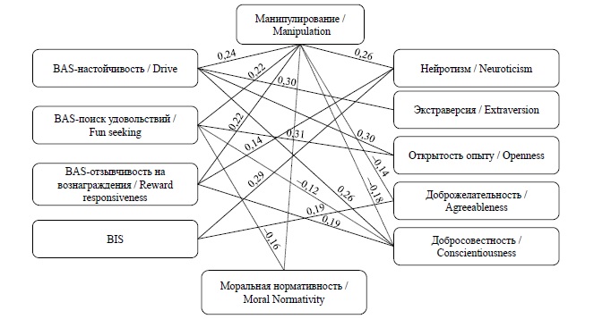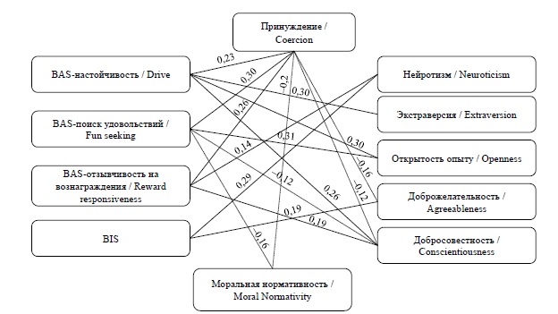 Принуждение – это стратегия взаимодействия, которая допускает использование любых форм давления на личность, вплоть до проявлений агрессии, с целью достичь результата без учета желаний и стремлений противоположной стороны. Принуждение положительно связано со всеми тремя шкалами BAS (настойчивостью, поиском удовольствий и развлечений, ожиданием награды) и отрицательно – с доброжелательностью, добросовестностью и моральной нормативностью (рис. 1). В свою очередь, различные аспекты BAS положительно коррелируют с экстраверсией, открытостью опыту, добросовестностью, а BIS – с нейротизмом и доброжелательностью. Эти результаты в целом подтверждают полученные ранее данные [10; 11] о взаимосвязи нейропсихологических и личностных факторов «Большой пятерки», что свидетельствует о существовании некоторых общих закономерностей.