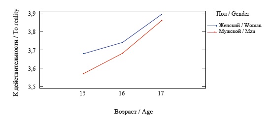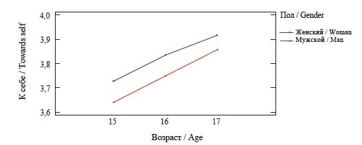 Результаты дисперсионного анализа свидетельствуют о том, что основной эффект наблюдается только для переменной «возраст». Чем старше подросток, тем в большей степени у него сформировано ценностное отношение к другим. Взаимодействие между факторами нулевое и основной эффект для фактора «пол» отсутствует. Данный результат отражает факт отсутствия значимых статистических различий между уровнем сформированности ценностного отношения к окружающему миру между мальчиками и девочками.